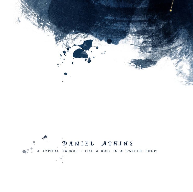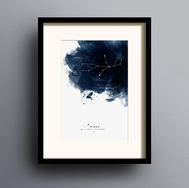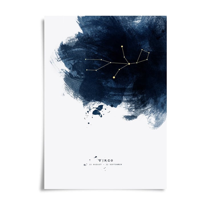 This digital gicle print is printed with a graphic Virgo constellation sitting on a dark inky blue brushstroke background and comes with the wording "Virgo 23 August - 22 September" as standard.
