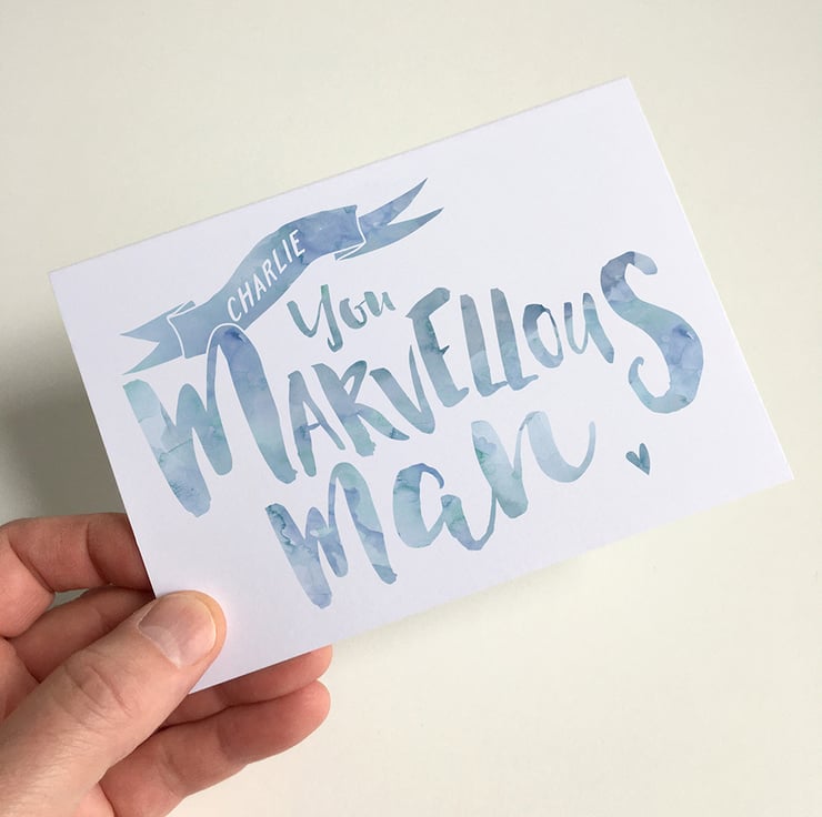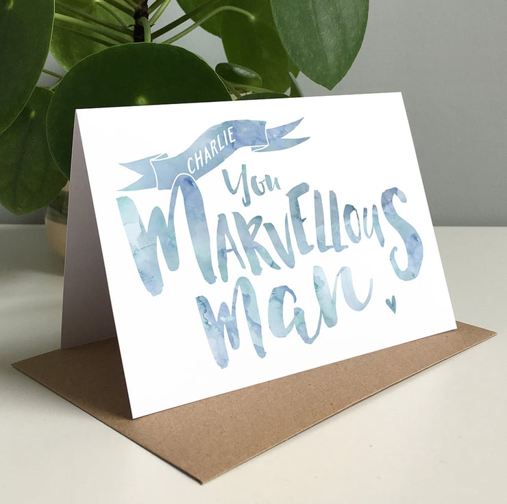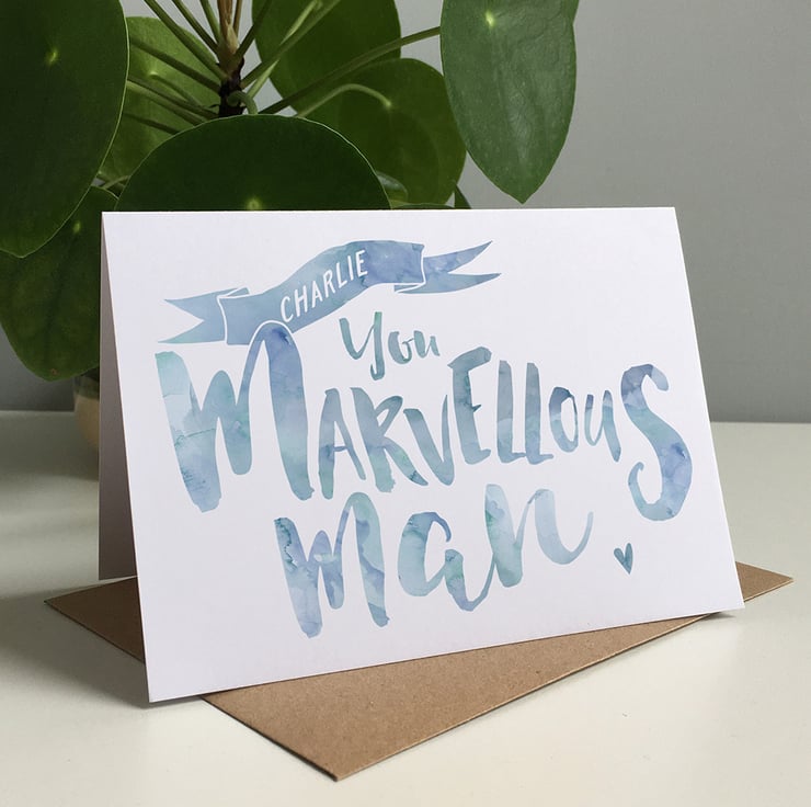 To create your own unique card, simply enter the marvellous man's name in the box provided. This will appear within the 'ribbon' motif at the top of your card. Please note: Please check your spelling when you enter your text, it will be printed as you supply it. We do try to pick up on any mistakes and may contact you to double check, but this cannot be guaranteed!