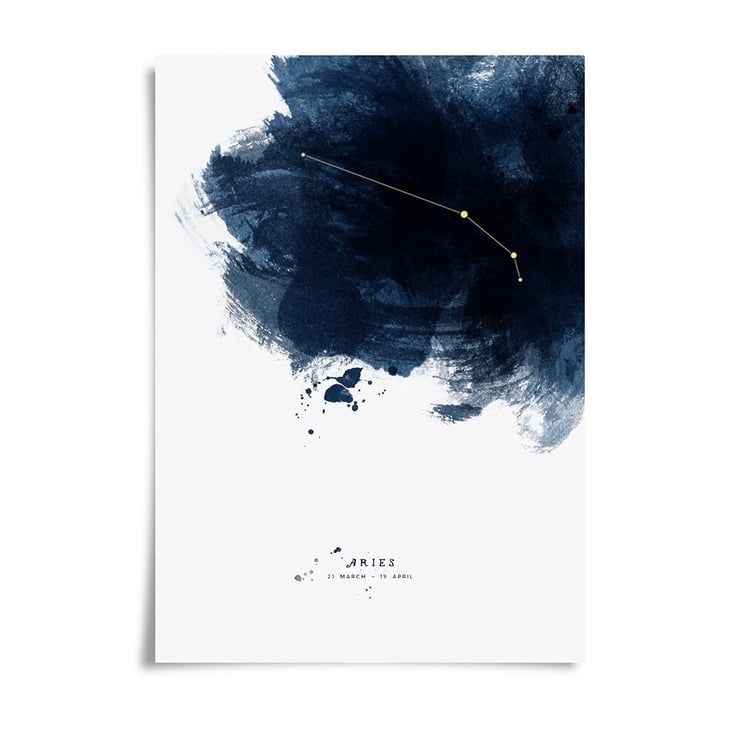 This digital gicle print is printed with a graphic Aries constellation sitting on a dark blue inky brushstroke background and comes with the wording "Aries 21 March - 19 April" as standard.
