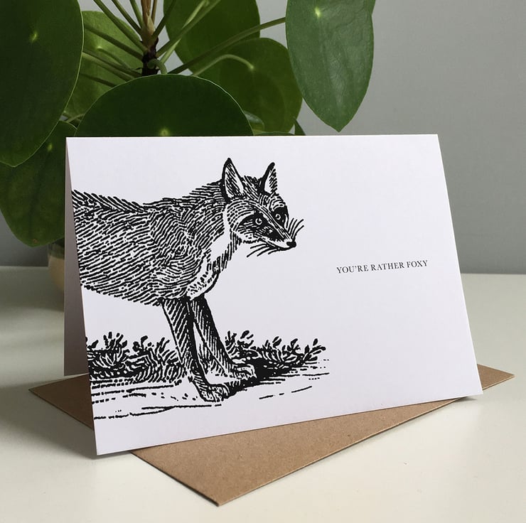 Using an antique fox woodblock illustration, this cheeky little A6 card may improve your romantic endeavours no end. Ideal to declare your love (without the usual hearts and flowers). This card comes with the words 'You're Rather Foxy' printed on the front as standard, but can be personalised with your own wording. You could add the recipient's name or alternatively you could get really foxy! Simply add your own words in the box provided. This will appear on the front of your card.