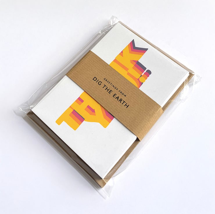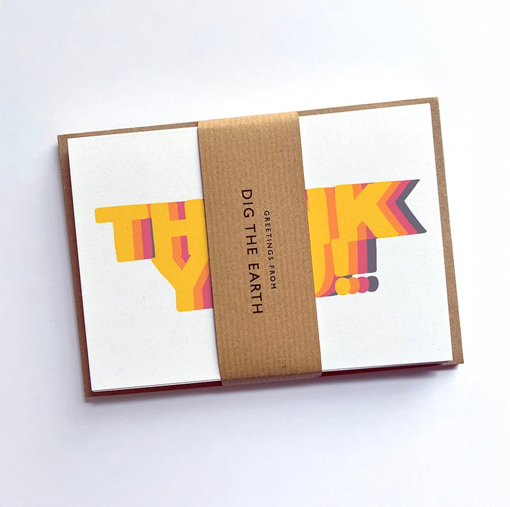 A beautiful set of eight 'thank you' greeting cards with envelopes. These wonderful retro eco-friendly A6 cards are printed with colourful repeat typography. The inners have been left blank for your own message. What a wonderful way to say thank you!