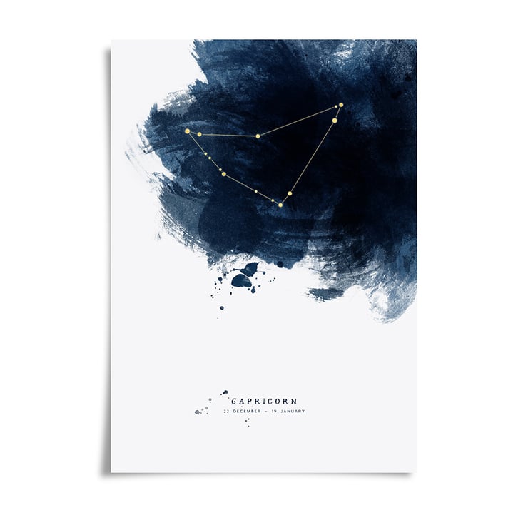 This digital gicle print is printed with a graphic Capricorn constellation sitting on an inky blue black brushstroke background and comes with the wording "Capricorn 22 December - 19 January" as standard.