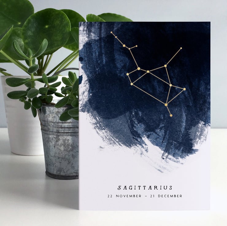This eco A6 birthday card shows an illustration of the Sagittarius constellation on a dark inky blue brushstroke background.