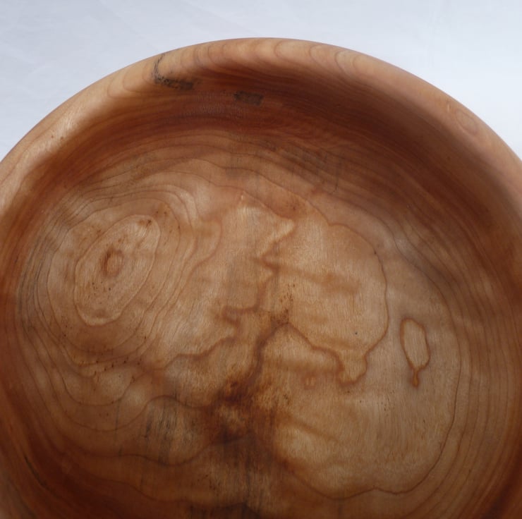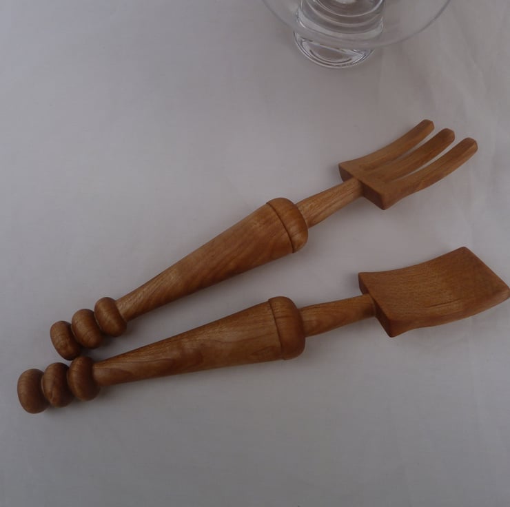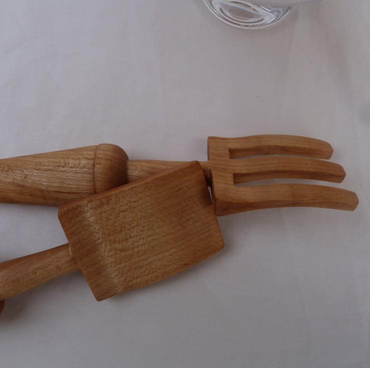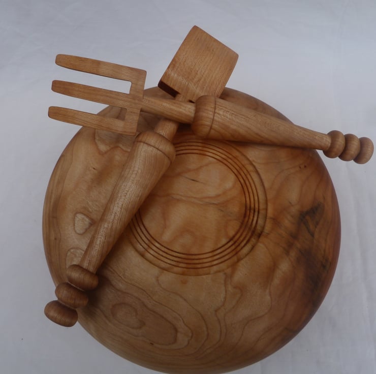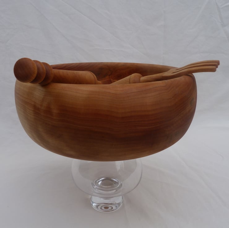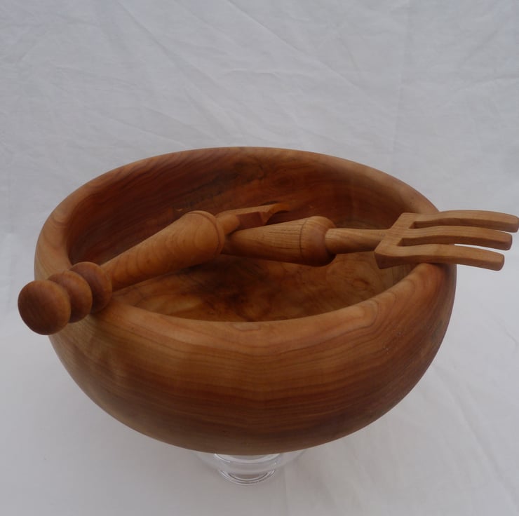 A salad bowl in English figured sycamore, with servers, turned and carved from the same tree. 10 inches in diameter, 4 inches deep and quite a chunky bowl. The servers are 9 1/2 inches long and 1 3/4 inches wide at the working end. All treated with chestnut foodsafe. Buyers from outside of the uk poa please