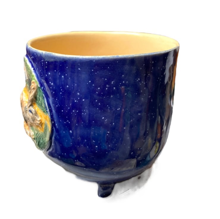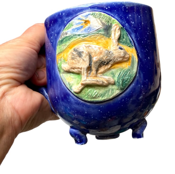 Unique hand built, single edition earthenware mug . It has three little feet and holds 300ml.