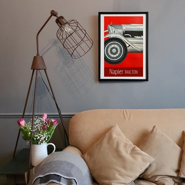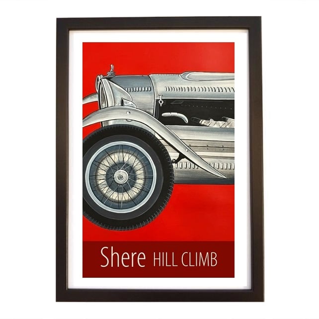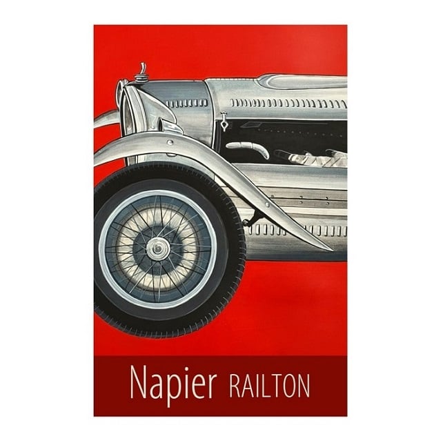 A contemporary travel poster style print of Brooklands' lap record holder, the historic Napier-Railton, a wonderful visitor to last year's Shere Hill Climb, from my own original acrylic painting.