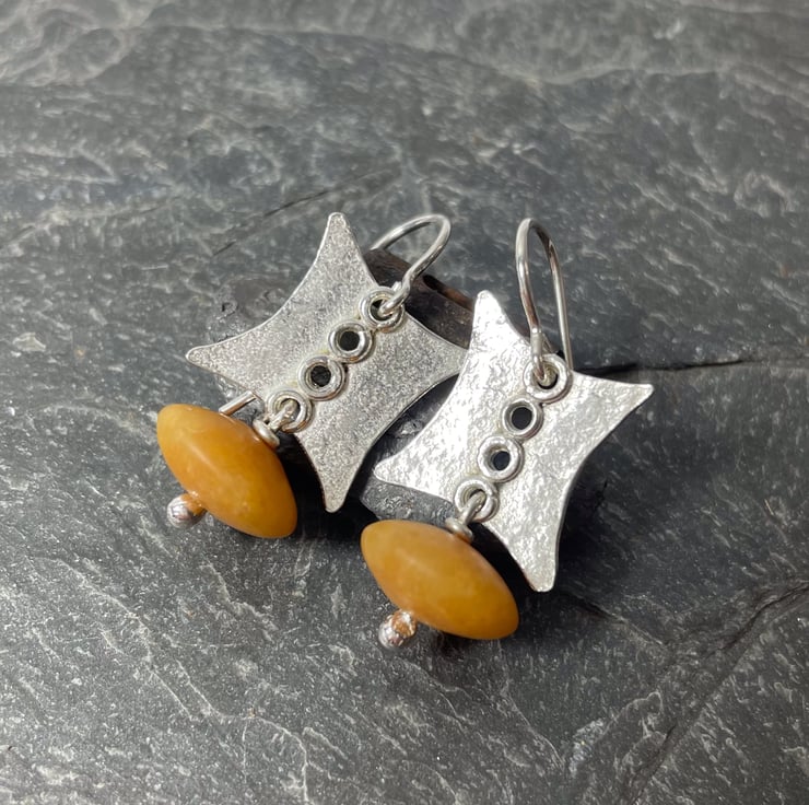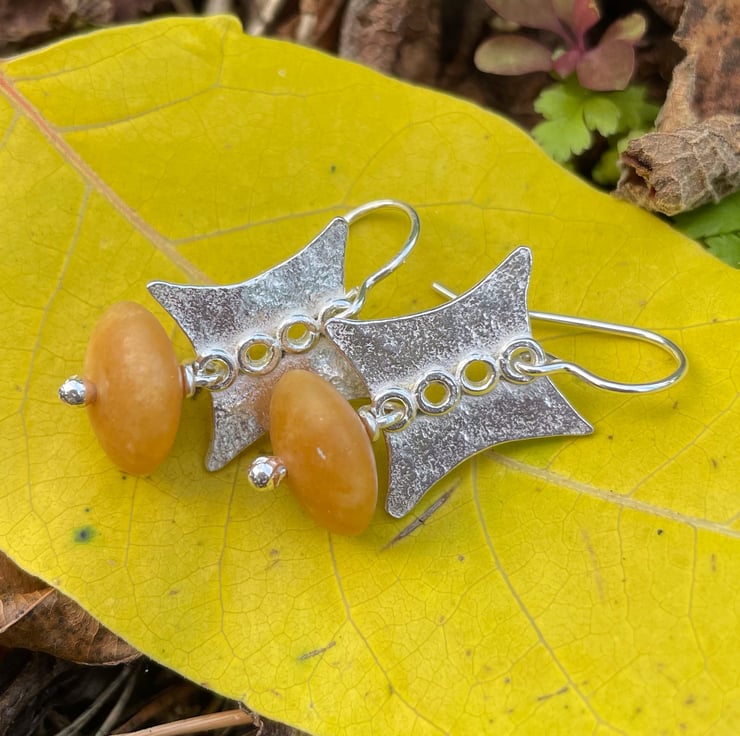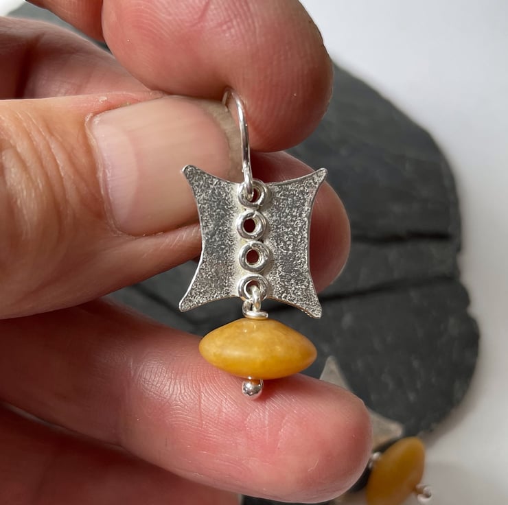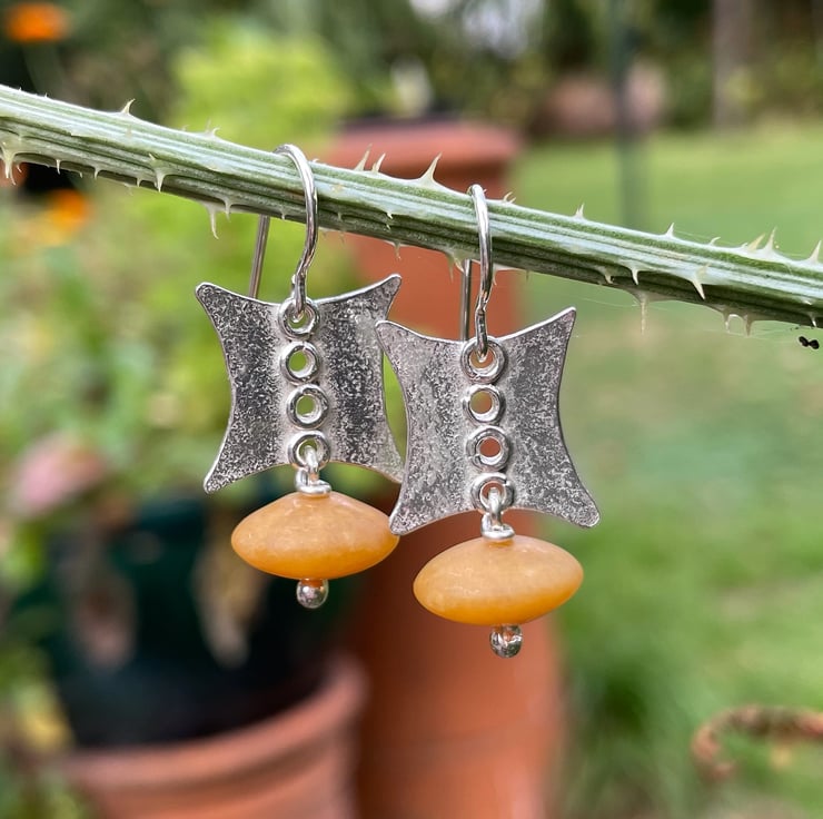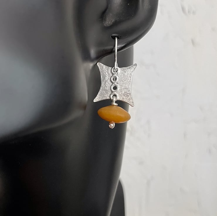 Small flared rectangles of silver have rings fused down the centre. I have drilled the rings and have used the top and bottom rings to hang an ear hook and a bead.