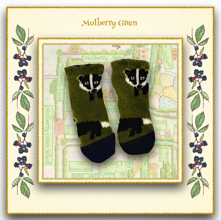 A cute little pair of olive green socks in a cute badger print to fit the Mulberry Green characters.