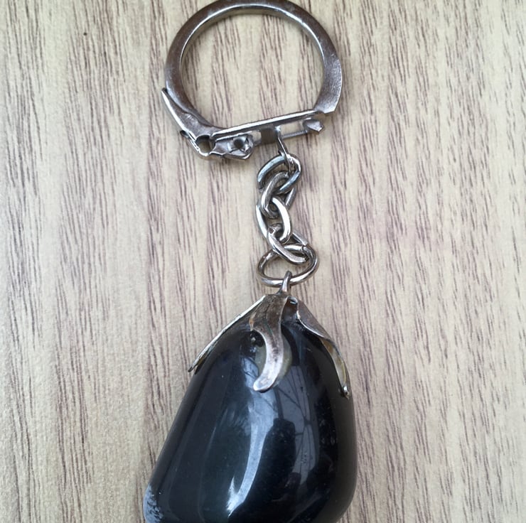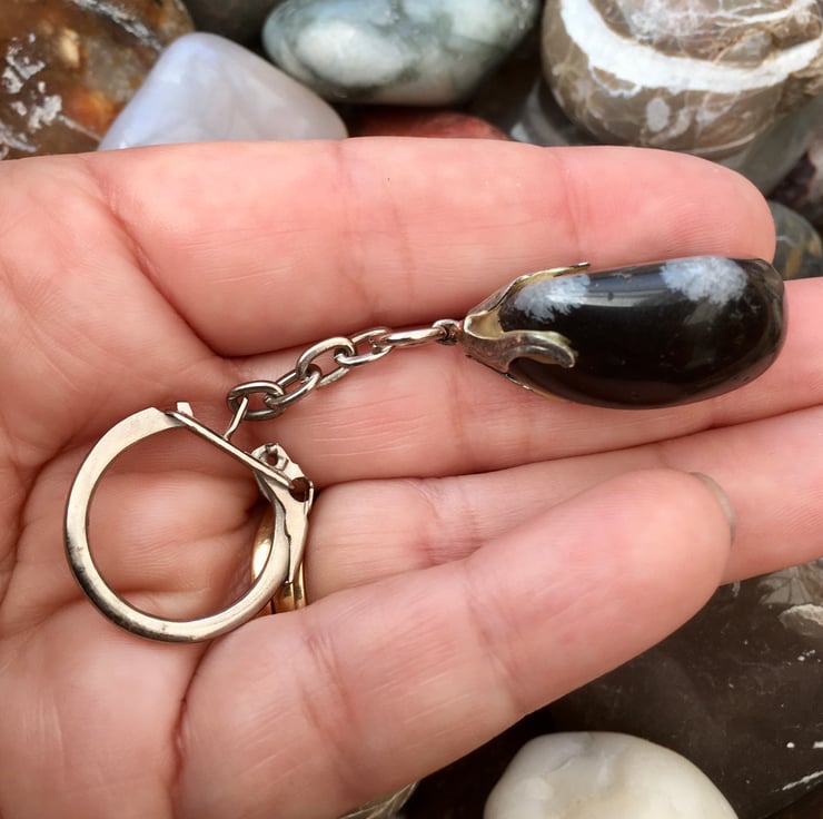 It is a highly polished tumblestone, beautuful from all aspects, which has silver tone crown bail fitment glued to the narrow end at the top, through which I placed silver tone small ring, curb chain and 2cm flip clasp, to allow this item to function as a keyring or handbag charm.