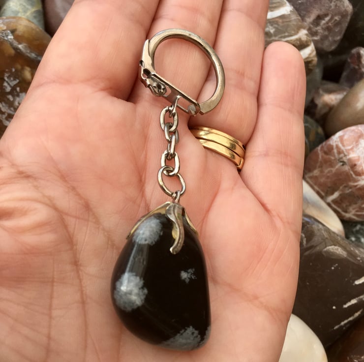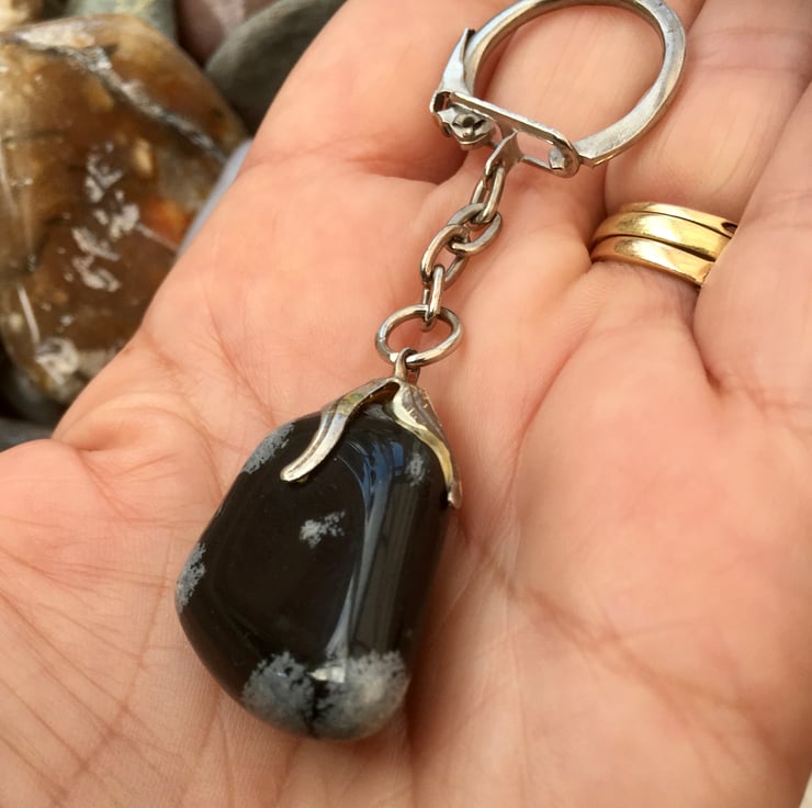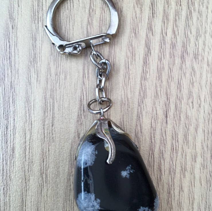 The snowflake obsidian is in a freeform rounded shape and alone measures approx 27mms in total length, with a width across the widest point of approx 20mms and a depth of approx 10mms, the whole keyring measures approx 78mms in length.