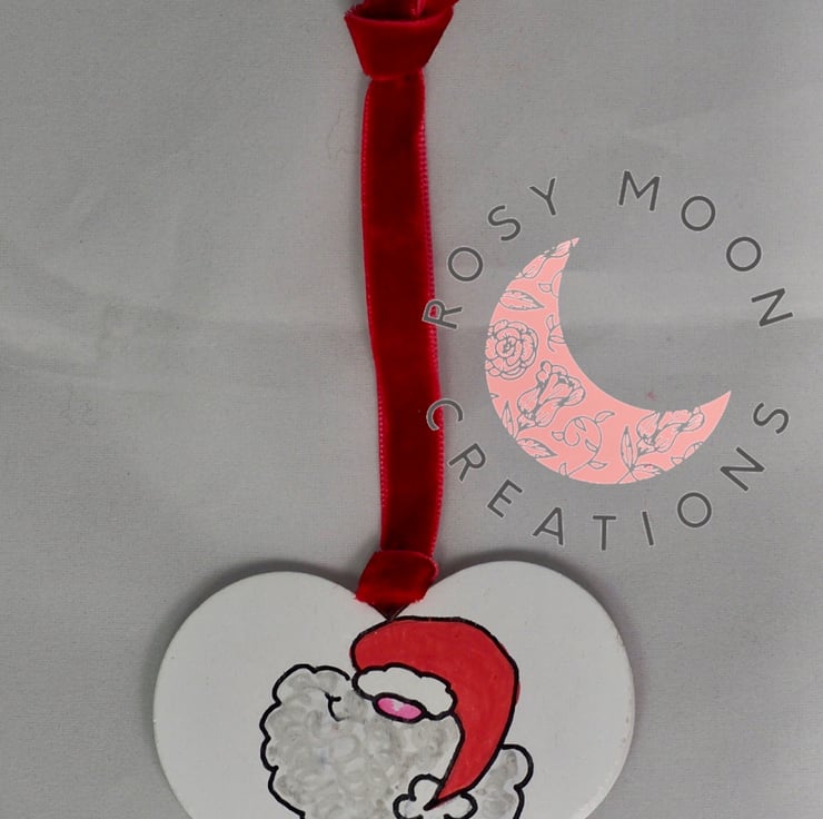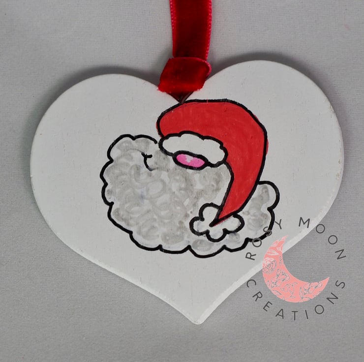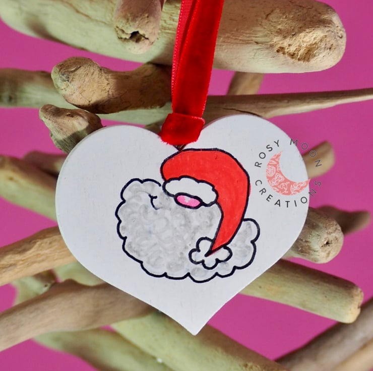 This wooden, 7x7cm, hand drawn Father Christmas decoration is a one-off and will add some extra cheer to your tree. It is sprayed with a protective coating to prevent smudging and fading. The hanging loop is a luxurious red velvet for a touch of glamour.