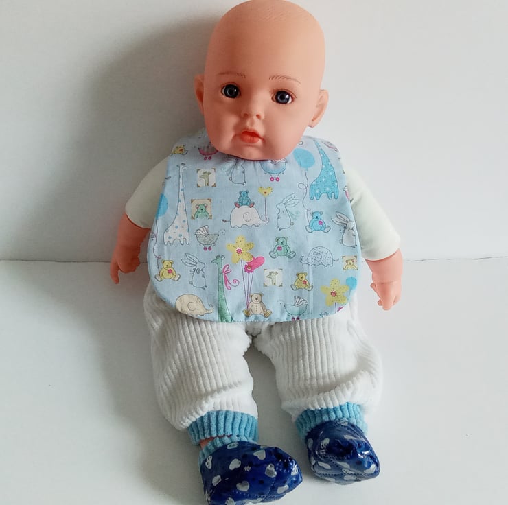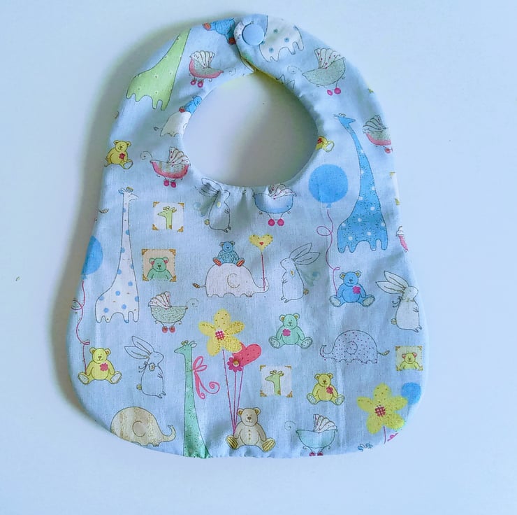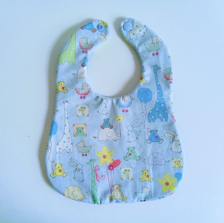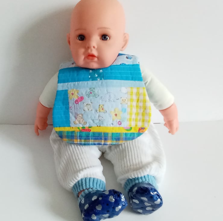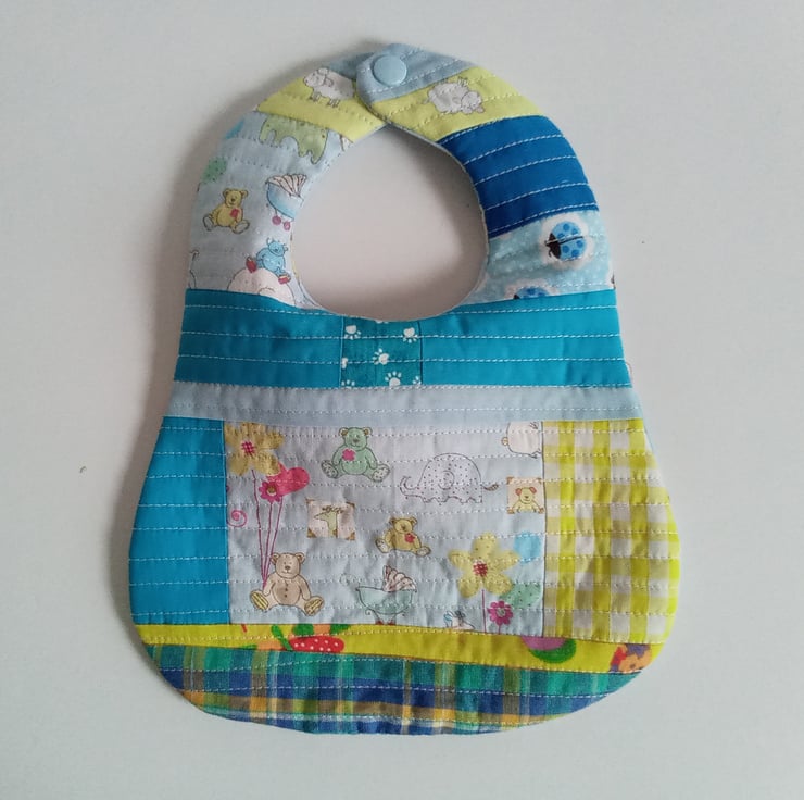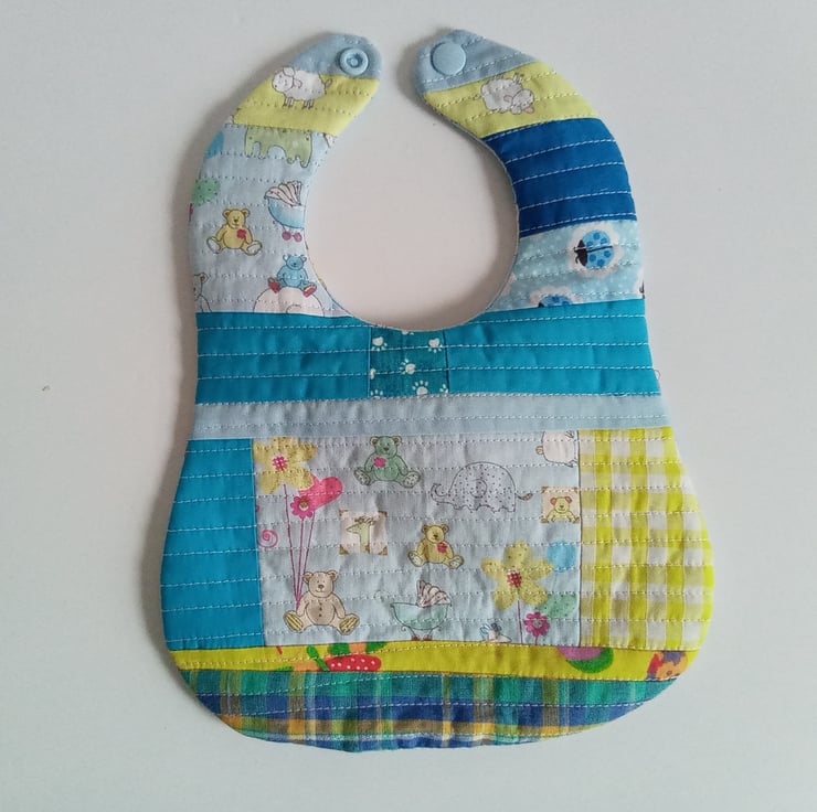 A small bib suitable for 0-3 months with a popper fastening. Reversible with quilted patchwork one side and a cute nursery design on the other side with a cotton batting centre.