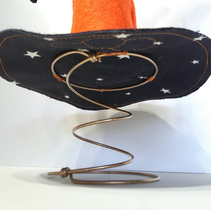 I've hand felted the Spider using died Scottish sheep wool and the legs are created using very narrow black ribbon. The Bats are made from felt and are attached to crafting wire. The Moon is made with a piece of glow in the dark cotton fabric. The group of 3 Pumpkins on the brim are made from felt with the vines created with more sheep wool. This fabulous Witches Hat has been attached to one of my vintage bed springs which I've spray painted gold.