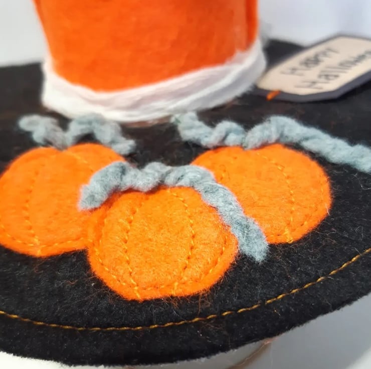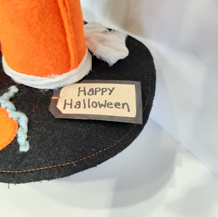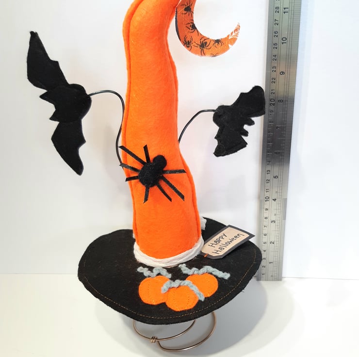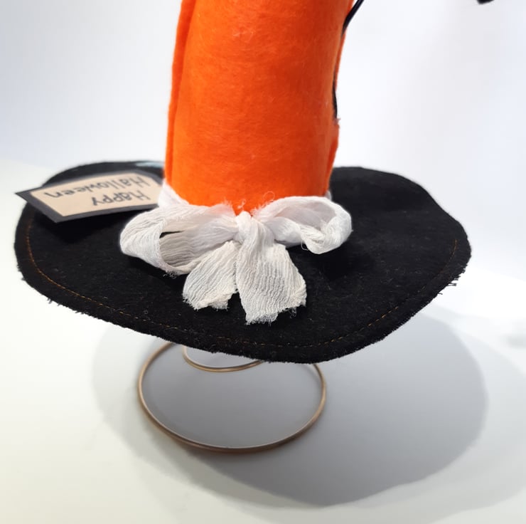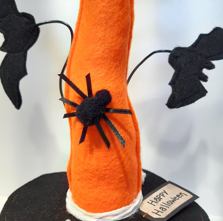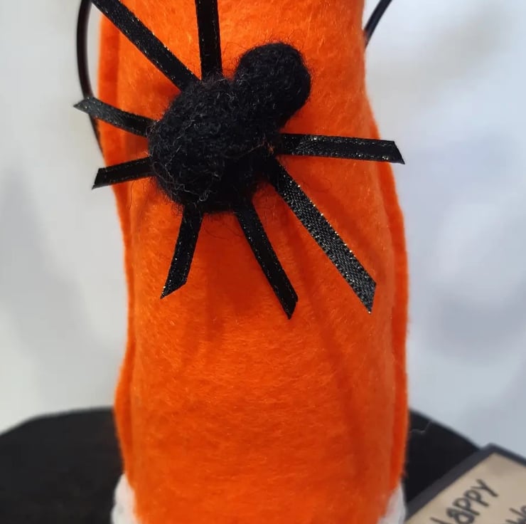 A gorgeous bright orange Witches Hat which has a big black hairy spider on the front along with bats on each side, a glow in the dark moon, a little group of 3 felt pumpkins and tied with a silk bow at the back. A fabulous addition to the Halloween Collection.