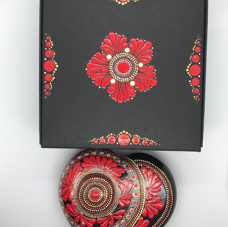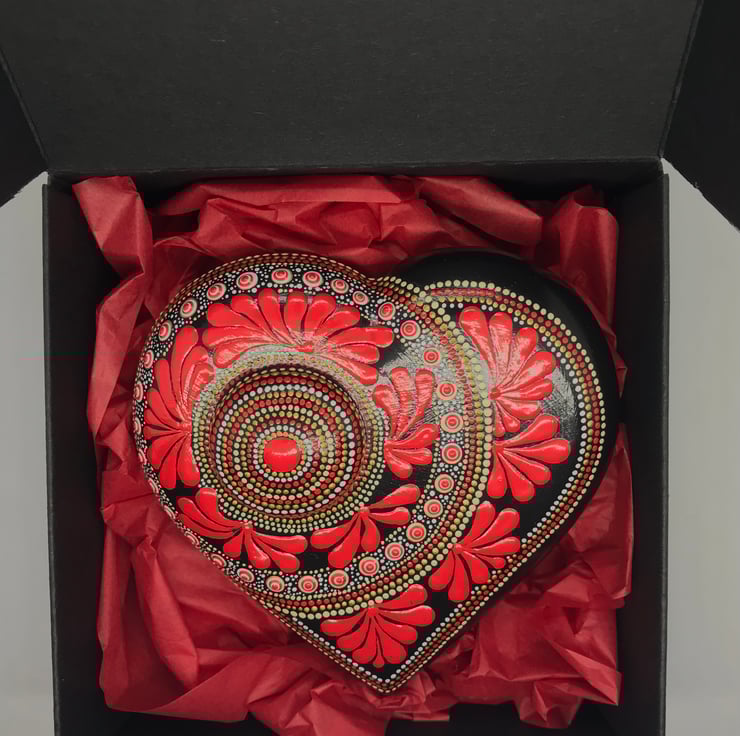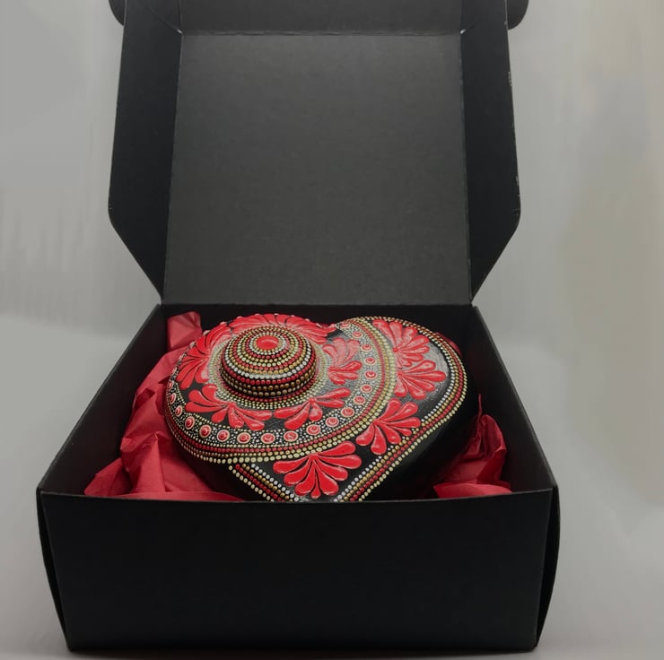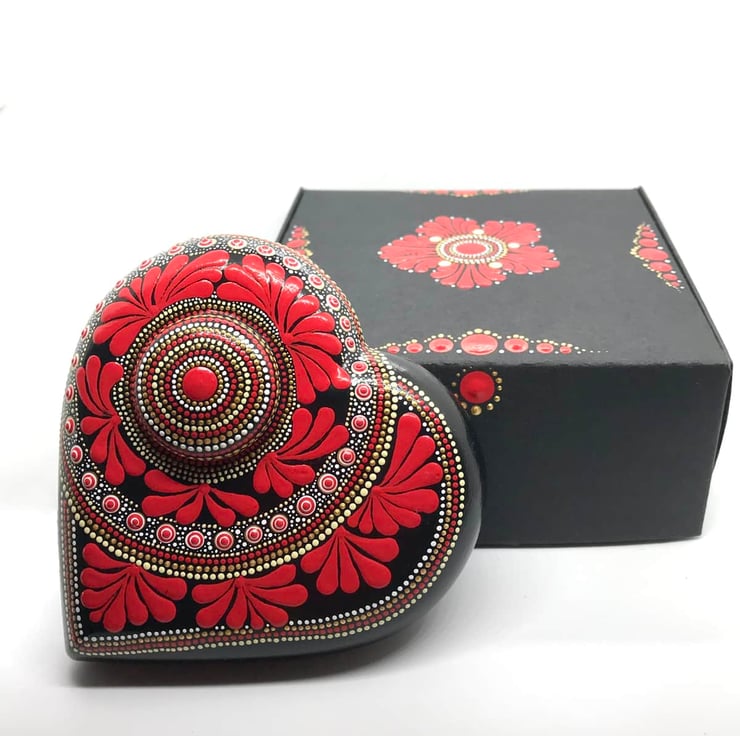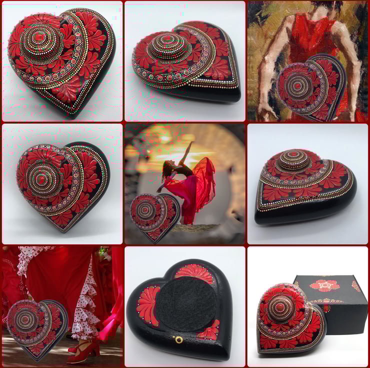 A 3D heart paperweight ornament, celebrating the passion & energy of Flamenco, hand-crafted by me from robust plaster and hand painted in a mandala style, with layered dots and petals.