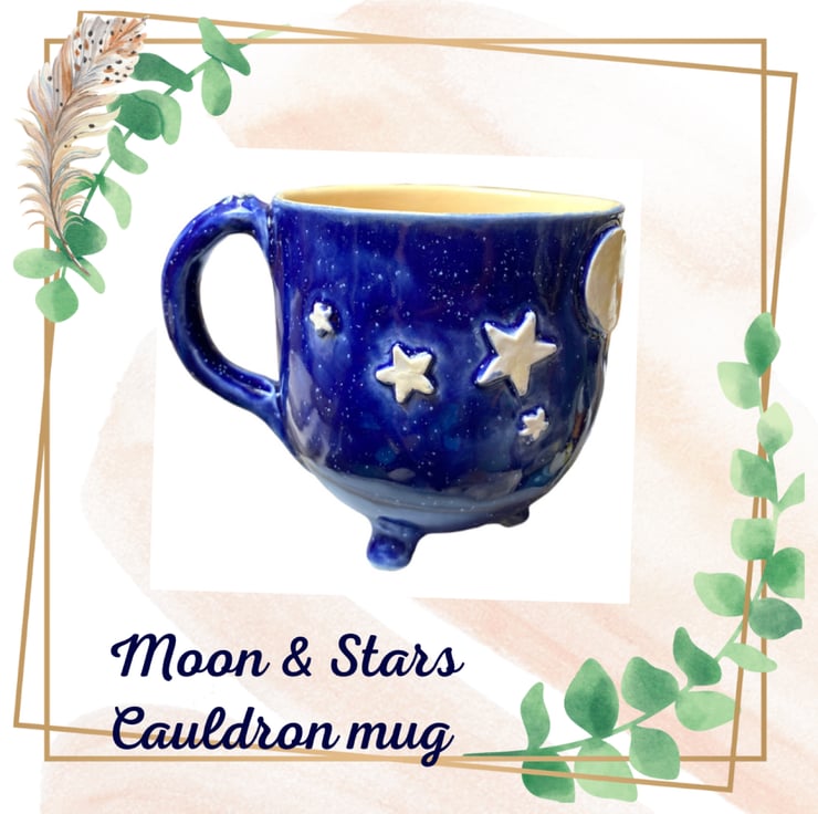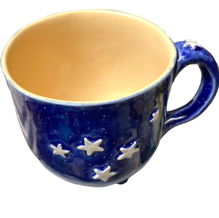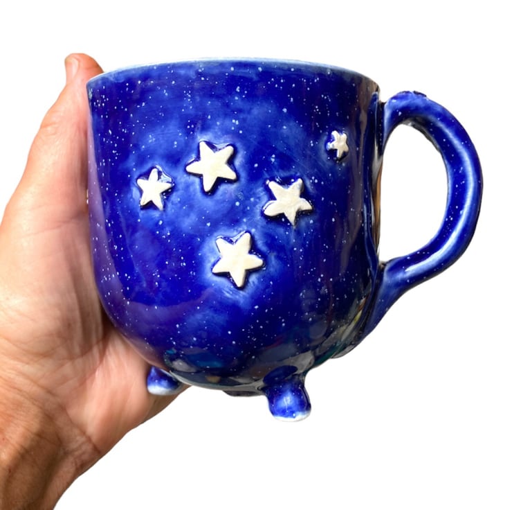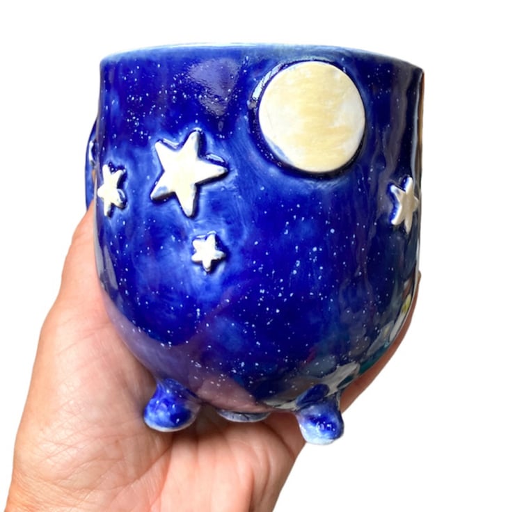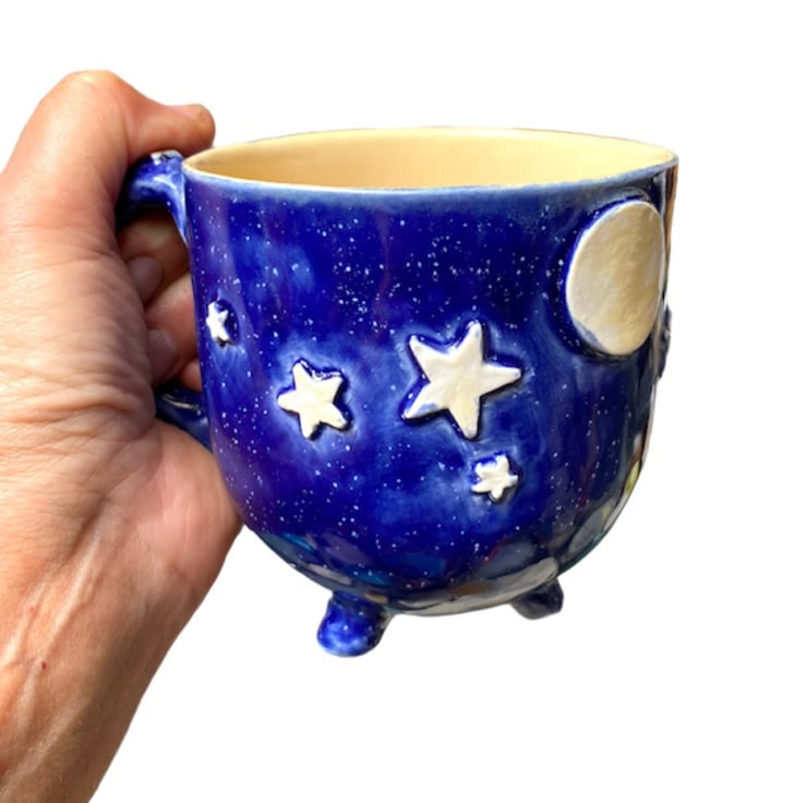 Unique hand built, single edition earthenware mug with the moon and stars added on as sprigged pieces. It has three little feet and holds 300ml.