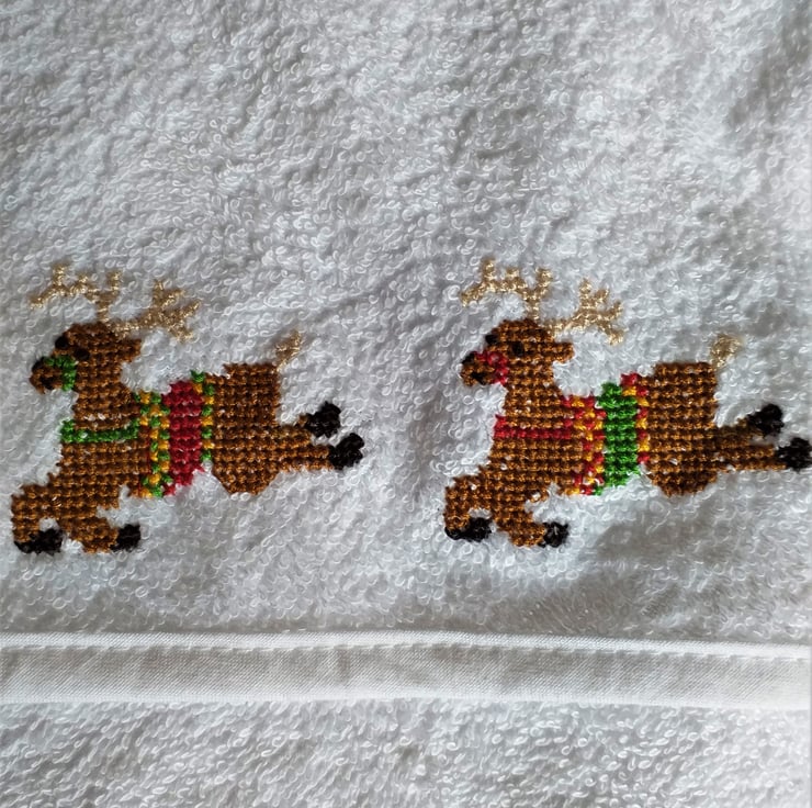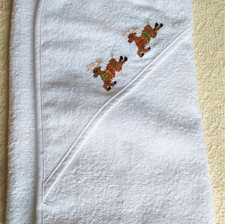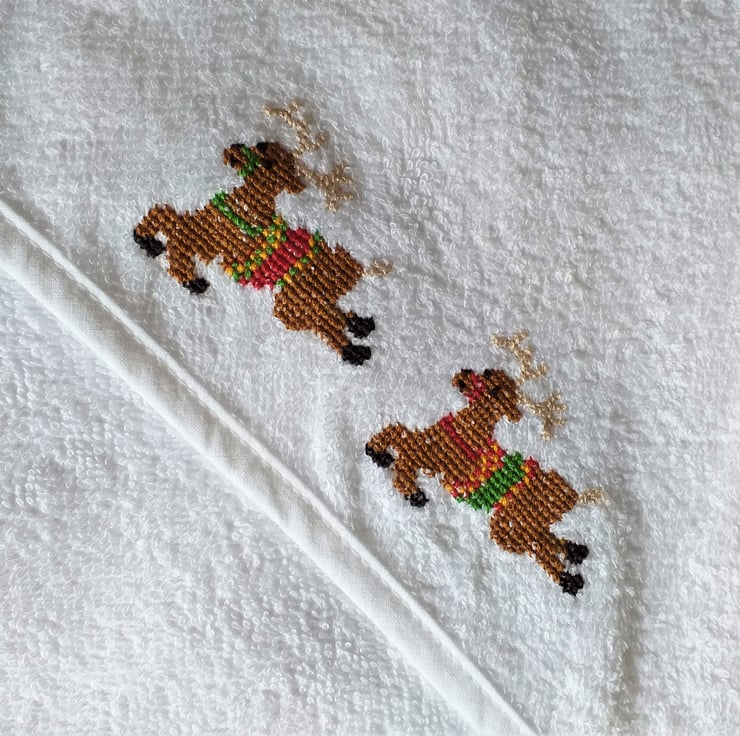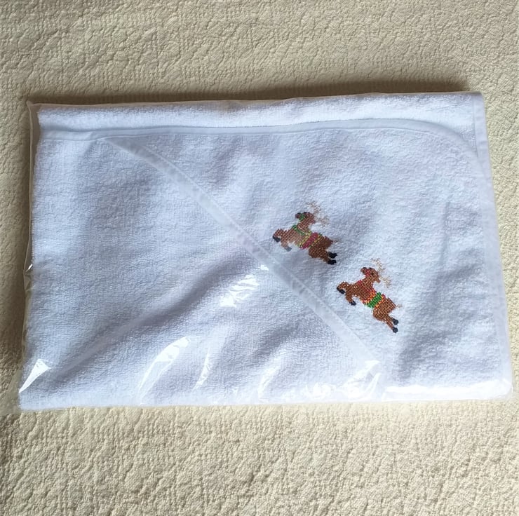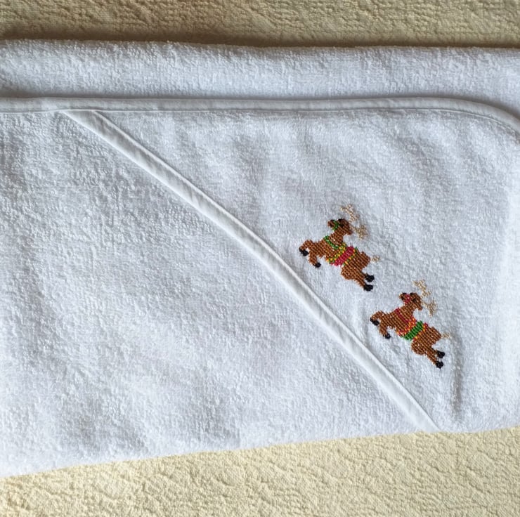 This is a lovely soft white, hooded baby towel. I have hand-embroidered a pair of leaping reindeer on the hood. They each sport a fine set of beige antlers, and they wear green, yellow and red saddles and bridles. The towel measures approximately 29" by 29" (75 x75 cm.) It is 100% cotton and can be machine washed to 40C.