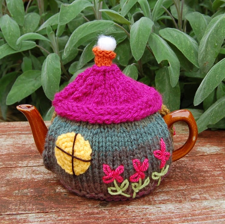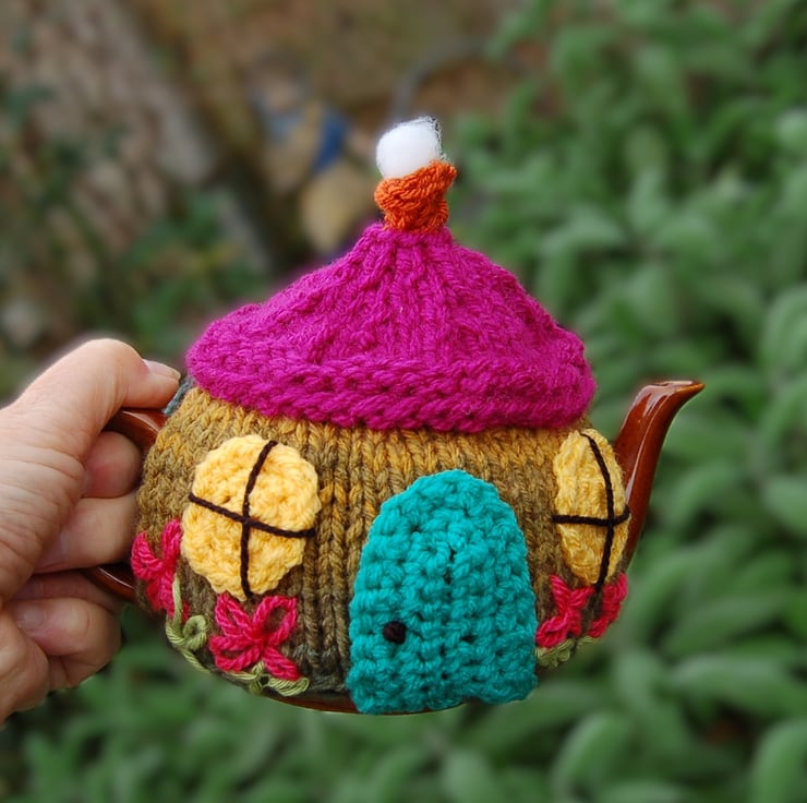 I've been knitting and crocheting tea cosies for many years. This is one of my favourites, there are so many ways to decorate a country cottage.