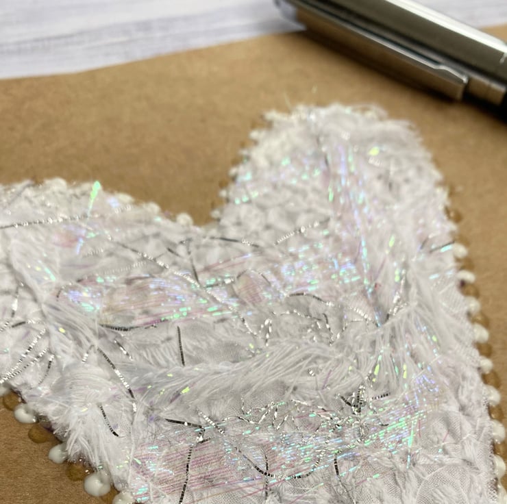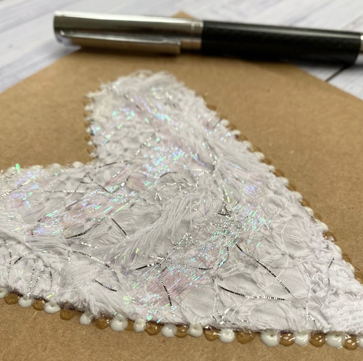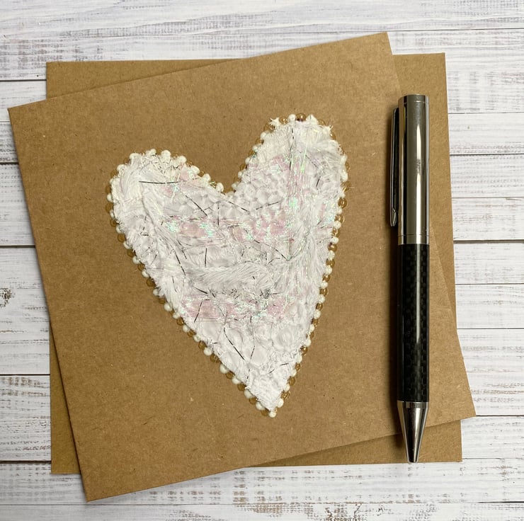 This subtle embroidered heart has been made with my own handmade up-cycled fabric. Its been made from threads, fibres, cottons and enhanced with free motion embroidery. It’s framed with 3-D dots and backed with brown card. It’s perfect for a wedding, anniversary, engagement, Valentines or for someone very special. It is blank inside making it ideal for any occasion. This brown card measures 14.5 x 14.5cm, comes with an envelop and in a plastic cover for protection.