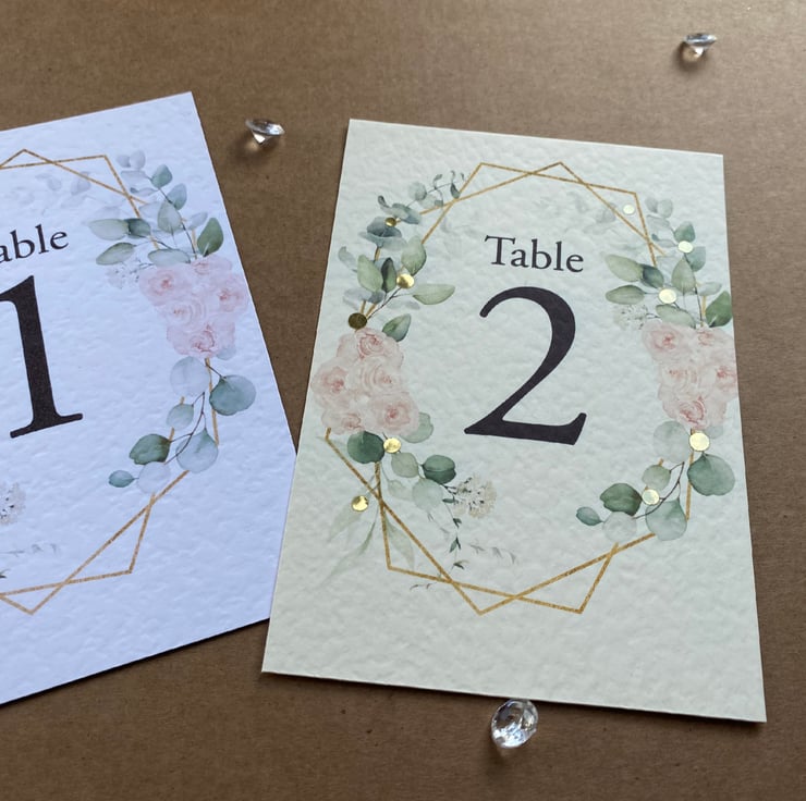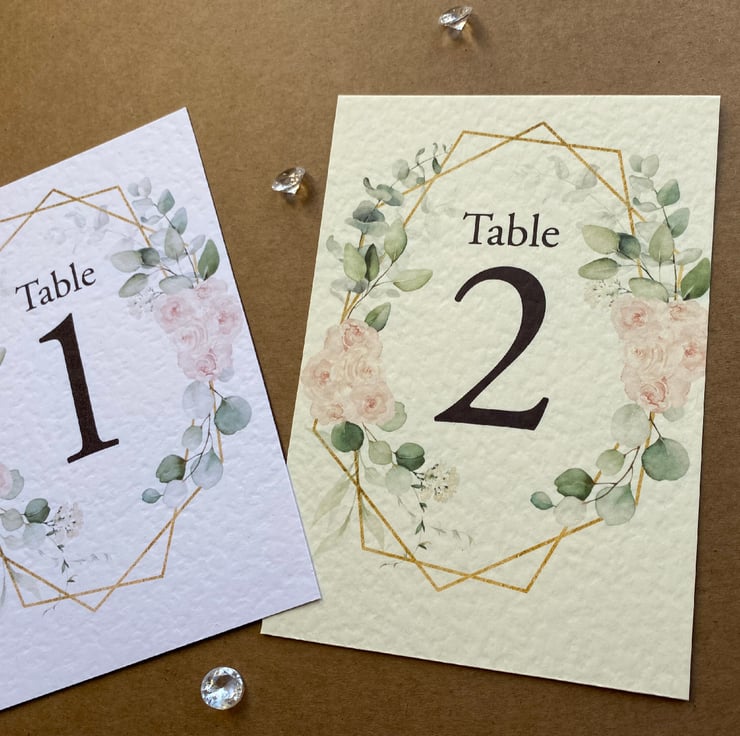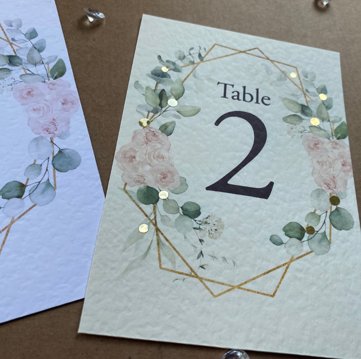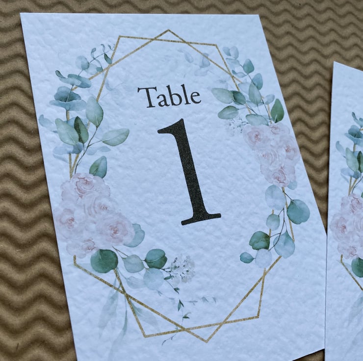 WEDDING table numbers, printed on A6 size cards. Blush pink roses, eucalyptus greenery and geometric frame, rustic wedding theme design.