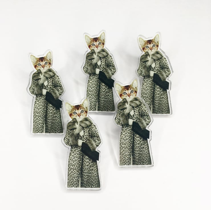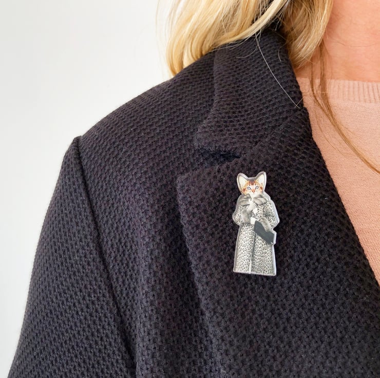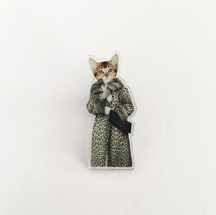 An elegant cat acrylic pin for feline and leopard print lovers.