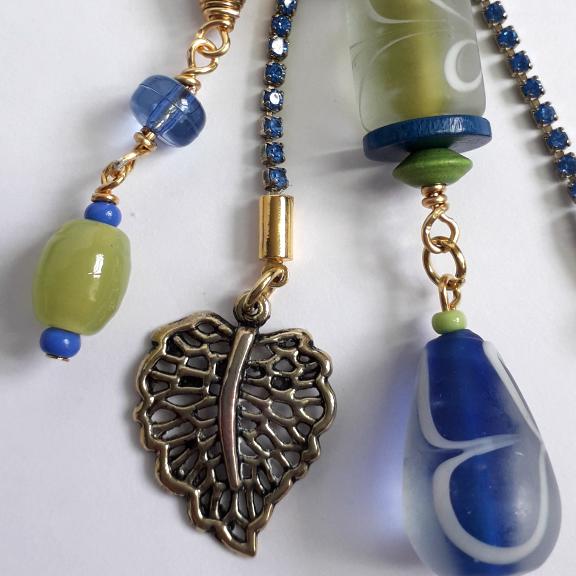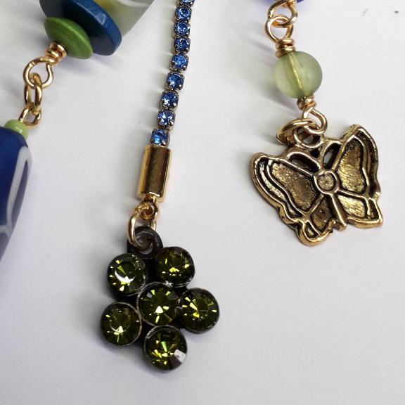I have made the dangles using glass beads and charms from broken jewellery, wooden beads and blue diamante' chain.