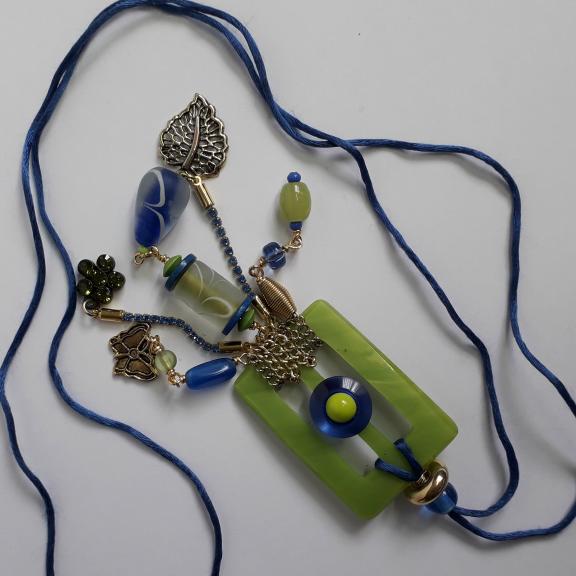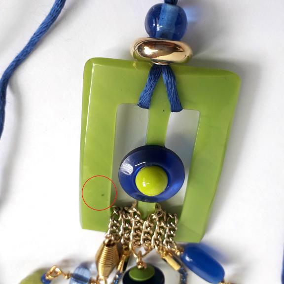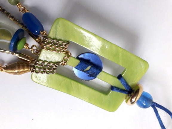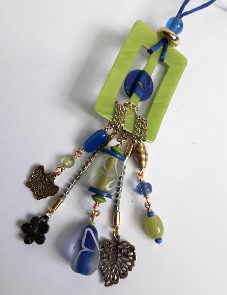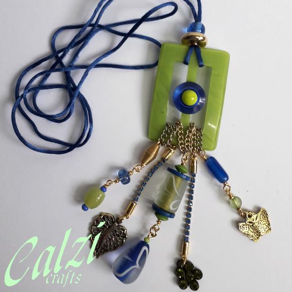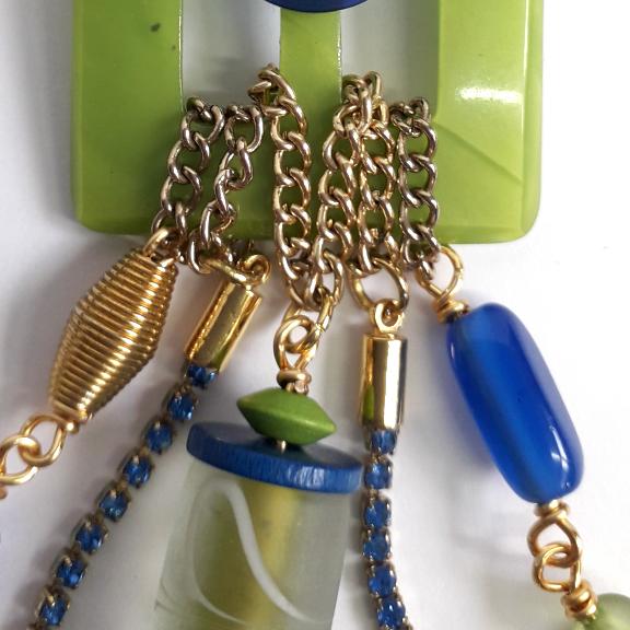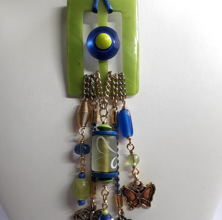The lime green vintage plastic buckle I have used for this necklace is 5cm x 3.5cm (2" x 1.5") I have suspended it on a royal blue silky cord which is 45cm (18") from the centre back to the top of the buckle then a further 13cm (5") to the end of the longest dangle. The length can be adjusted by simply tying a knot in the cord.