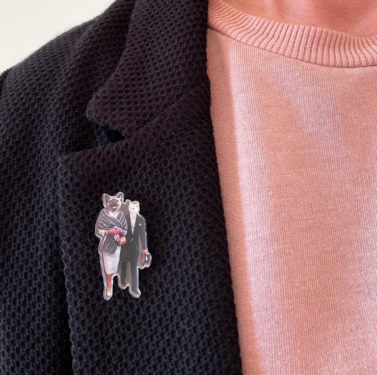 A funny cat acrylic pin for feline lovers. This pair are deeply in love. He is rather shy while she is the life of the party.