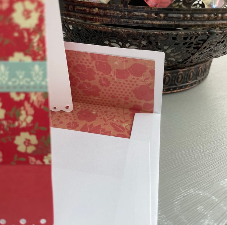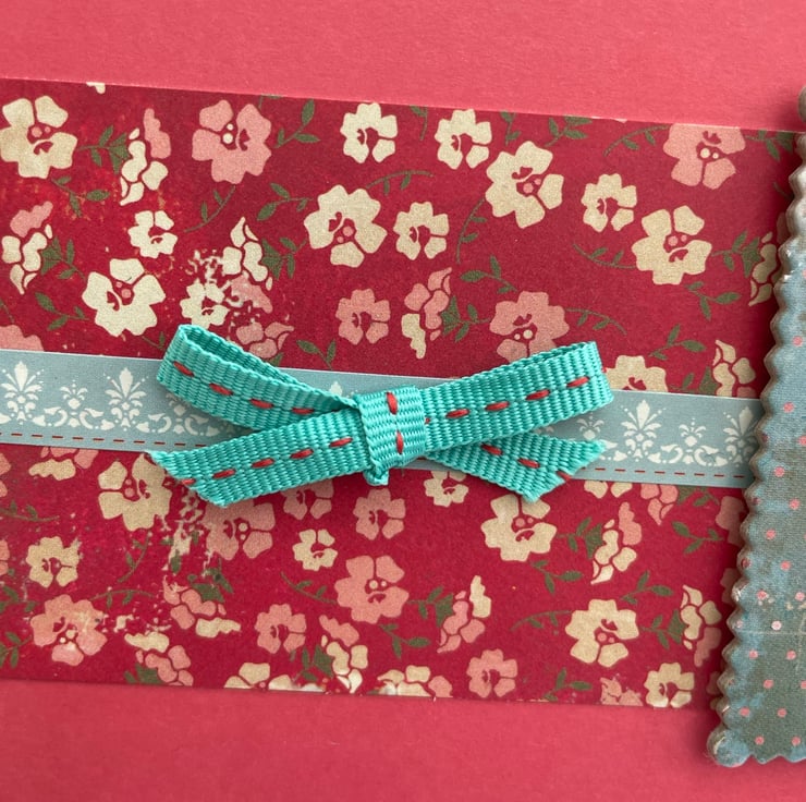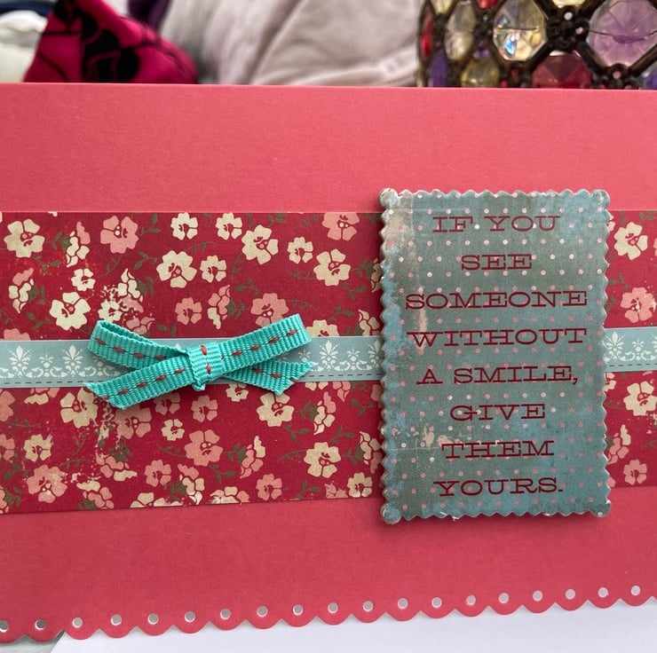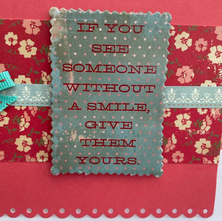 A lovely card with a lovely sentiment. This 17x11.5cm card has a red background that is topped with a strip of matching red floral paper which is topped with a turquoise patterned sticker strip. This is topped with a turquoise grosgrain bow and a chipboard topper that says If you see someone without a smile, give them yours, a very uplifting sentiment. Inside the card has the greeting With love. It has a matching envelope with a liner in matching paper.