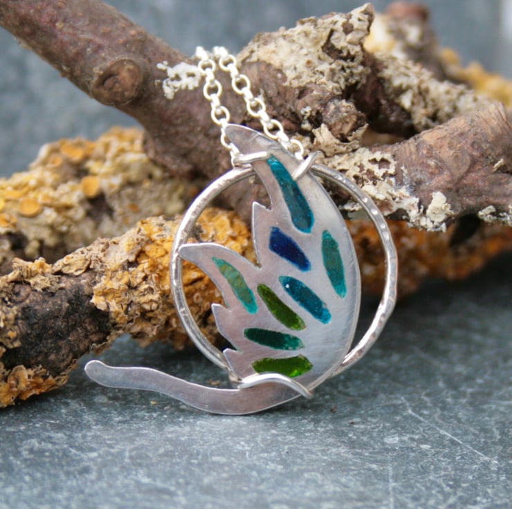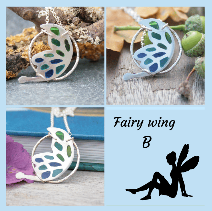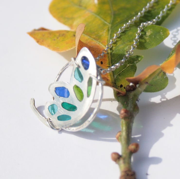 This is such a magical pendant. I have created this silver fairy wing necklace using the plique-a-jour enamel technique with sterling silver. This technique involves cutting out the fairy wing shape and then creating the small cut out areas with a jewellers saw. These areas are then filled with wet transparent enamel which is left to dry out and then fired in a kiln. This is repeated many times until the areas of the wing are filled. It's a slow process that takes patience and a steady hand.