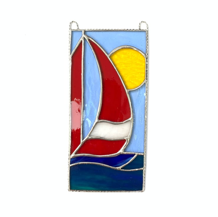 If you are off to the seaside you might get a glimpse of a sailboat or two. This pretty stained glass panel shows a boat in full sail and would be great for any sailing enthusiast.