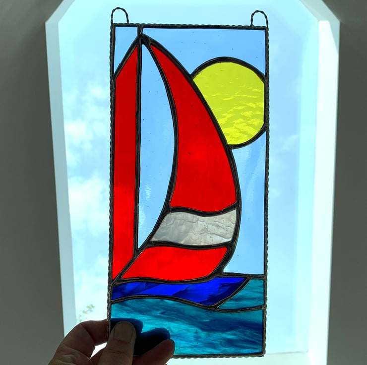 Each piece of glass in this sun catcher has been hand cut, ground, washed, copper foiled and solder together to form a beautiful picture of a sailing boat before being washed again and polished, I have added a decorative boarder made of twisted wire. A length of fishing line has been attached for hanging purposes.