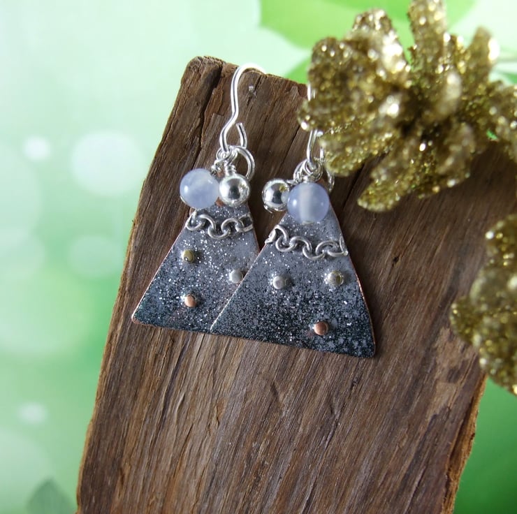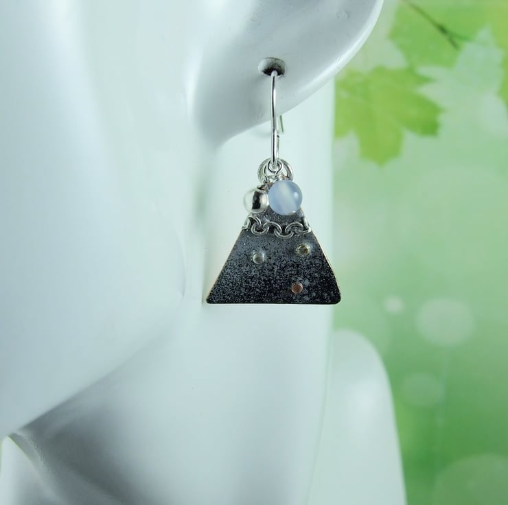 Christmas Earrings. Sterling silver and copper with Grey and Silver enamel and silver and blue lace agate beads.