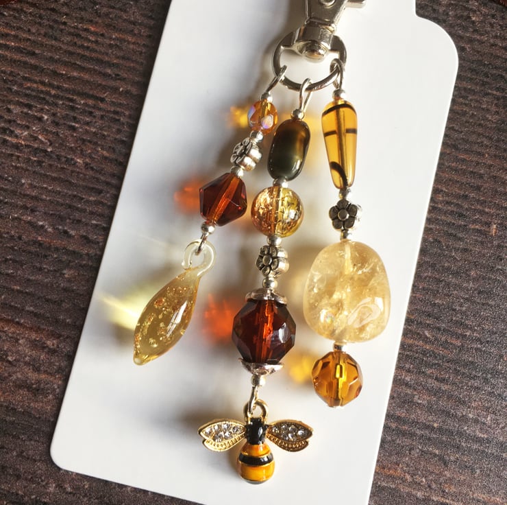 This pretty bag charm has a small metal bee, Citrine nugget and a selection of glass beads in amber and honey tones. I've also used tiny silver-tone flower spacers and bead caps.