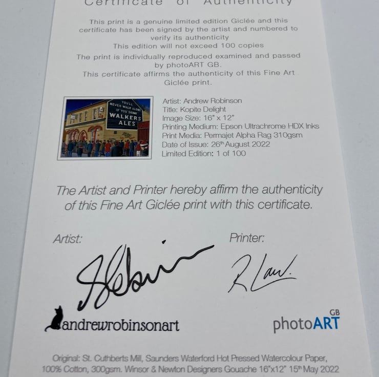 The framed print comes with a 'Certificate of Authenticity' which documents the details of the original painting and the art print. The Certificate of Authenticity is affirmed with a signature from both myself (the artist) and the printer.