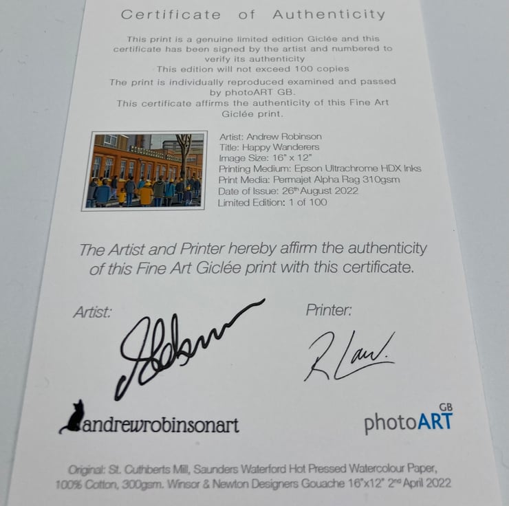 The framed print comes with a 'Certificate of Authenticity' which documents the details of the original painting and the art print. The Certificate of Authenticity is affirmed with a signature from both myself (the artist) and the printer.
