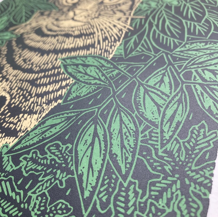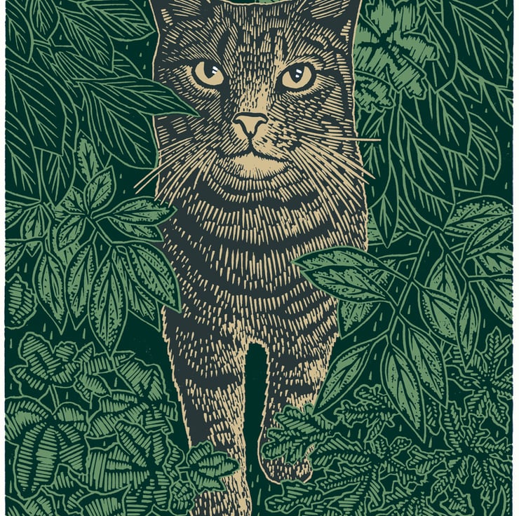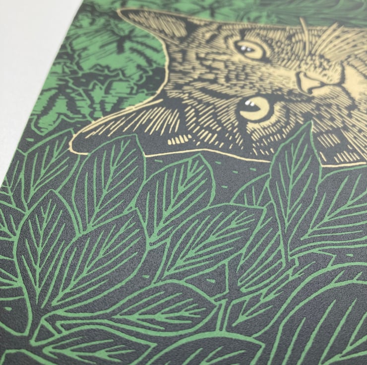 This is the second print I have made of him. This time I wanted to capture him awake, hiding amongst the plants in the garden, in a moment of calm before chasing another fly.