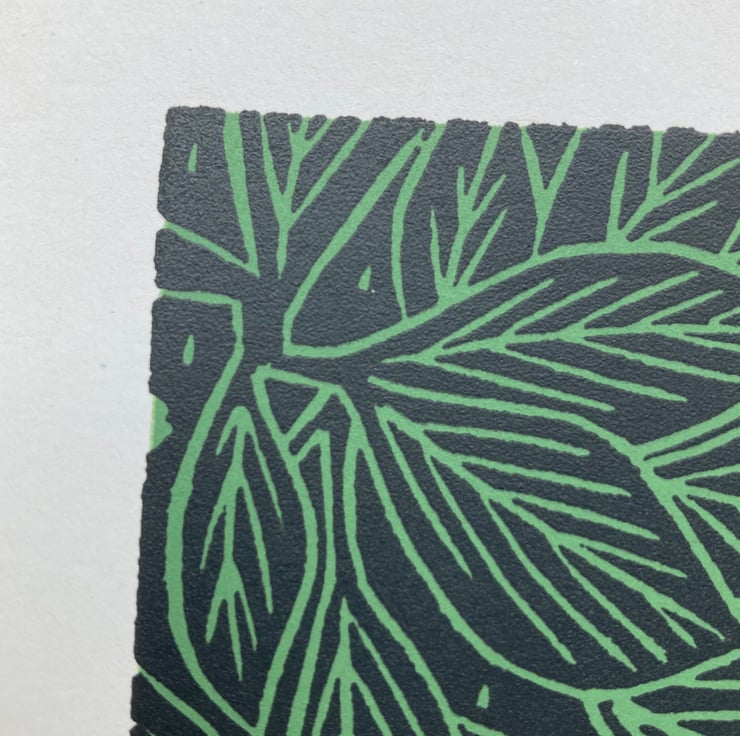 Green, cream and dark grey System 3 inks on off-white recycled Cyclux 300gsm acid-free paper. From an edition of 55, signed, titled and numbered. I created the image initially as a linocut print, and then transferred the image to a silk-screen to hand-print the edition.