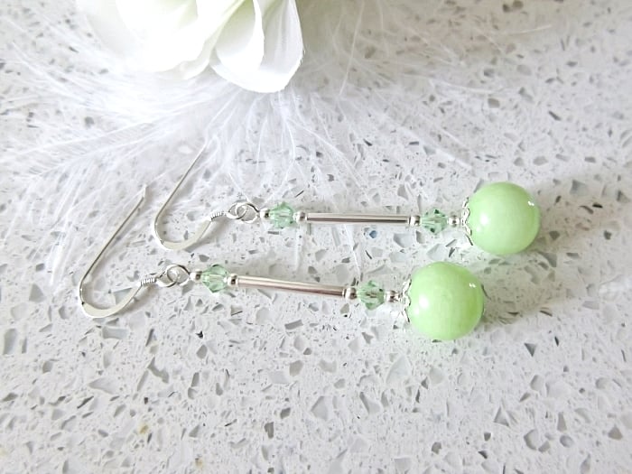 For these 1920s inspired earrings I chose Quartzite in a beautiful lime green shade. These stunning semi precious gemstones are 10mm wide & are complemented with toning sparkly crystals from the world famous crystal company in Austria.