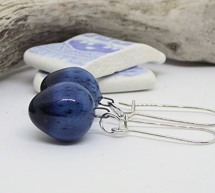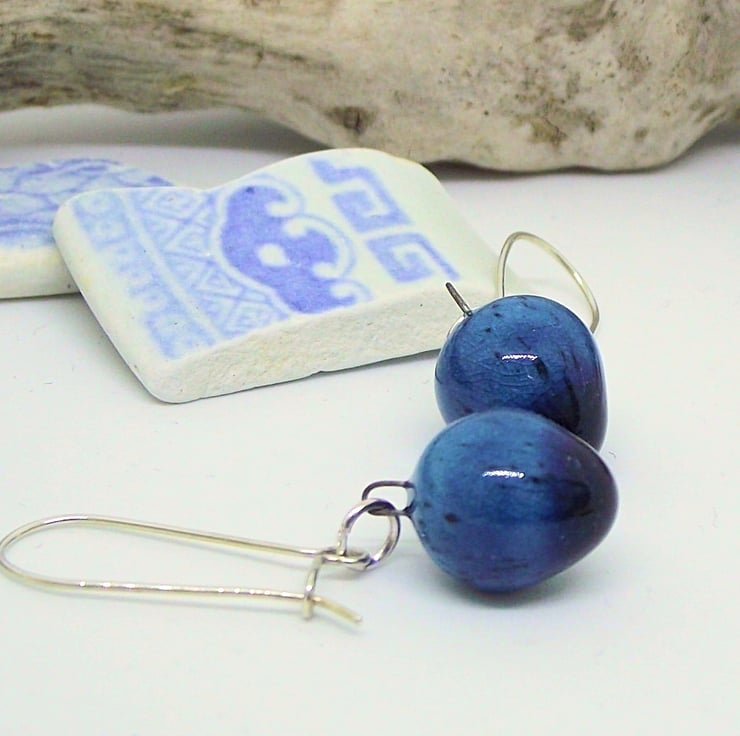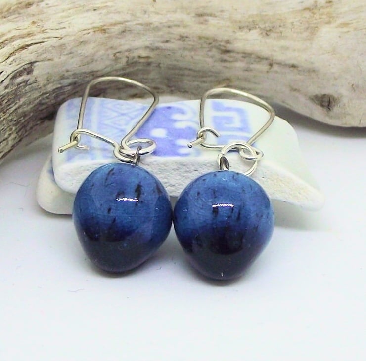 Unusual shape dark blue and black ceramic bead earrings. Sterling Silver handmade ear wires, silver plate jump ring and steel wire connectors. Earring drop 45mm.