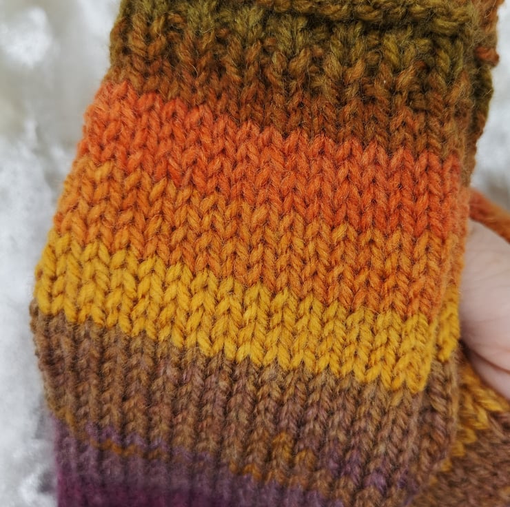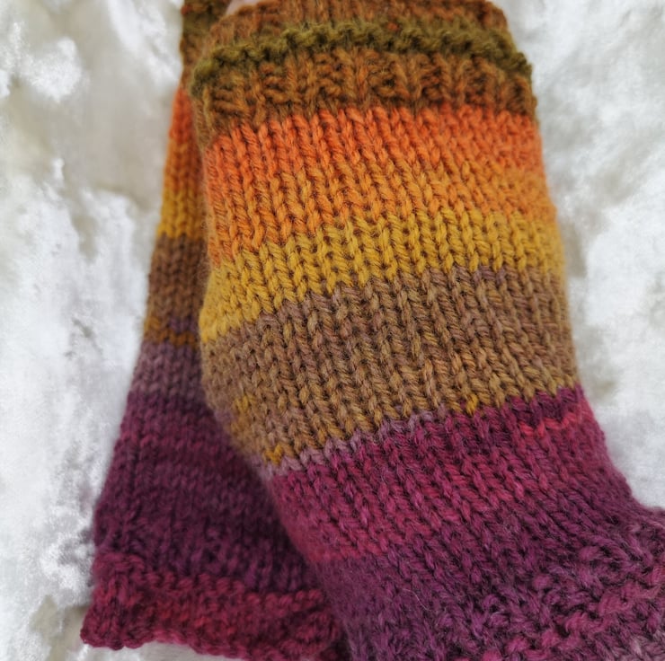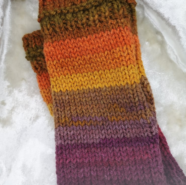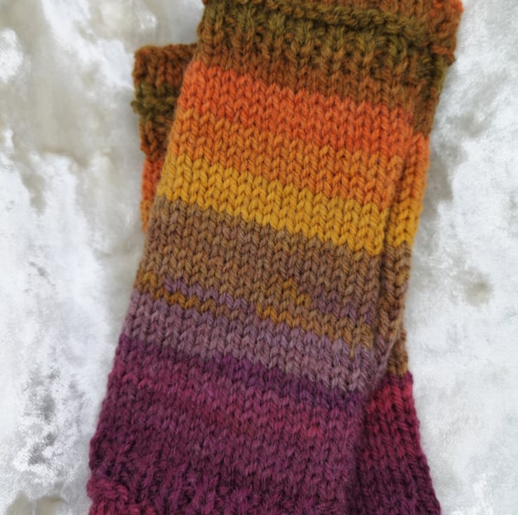 Autumn shades gloves, fingerless mittens No. 2, these are in muted shades of Rose pink, Deep rose. orange and gold. Handmade in Devon from vegan yarn that is soft and warm but not heavy, You can still do all the things that interest you and have warm hands. A gift of love for those with finger joint pain, you can still hold a book, eat your sandwich or hug the cat while wearing these gloves.