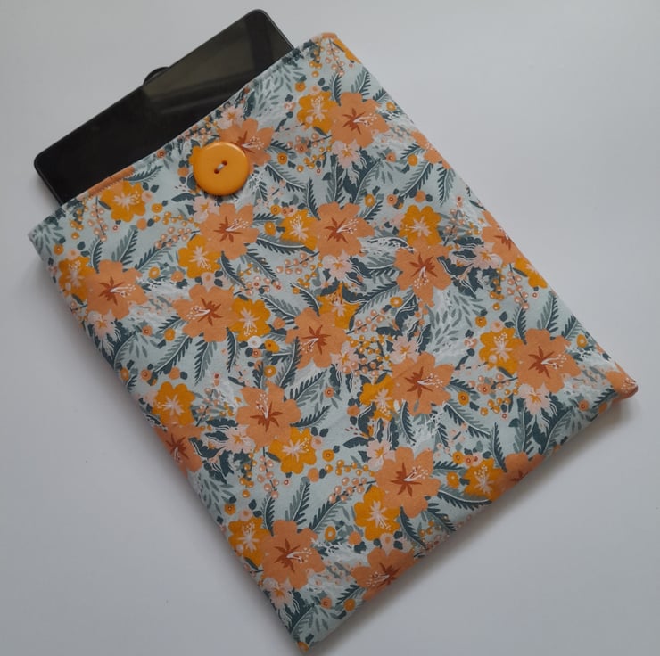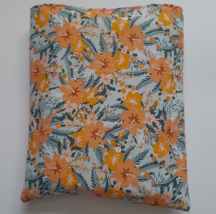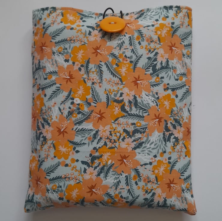 The sleeve is made out of an orange tropical flower design cotton fabric on the outside and a pale blue cotton fabric on the inside. The sleeve is padded for extra protection for your book and a button with elastic is used to close your sleeve