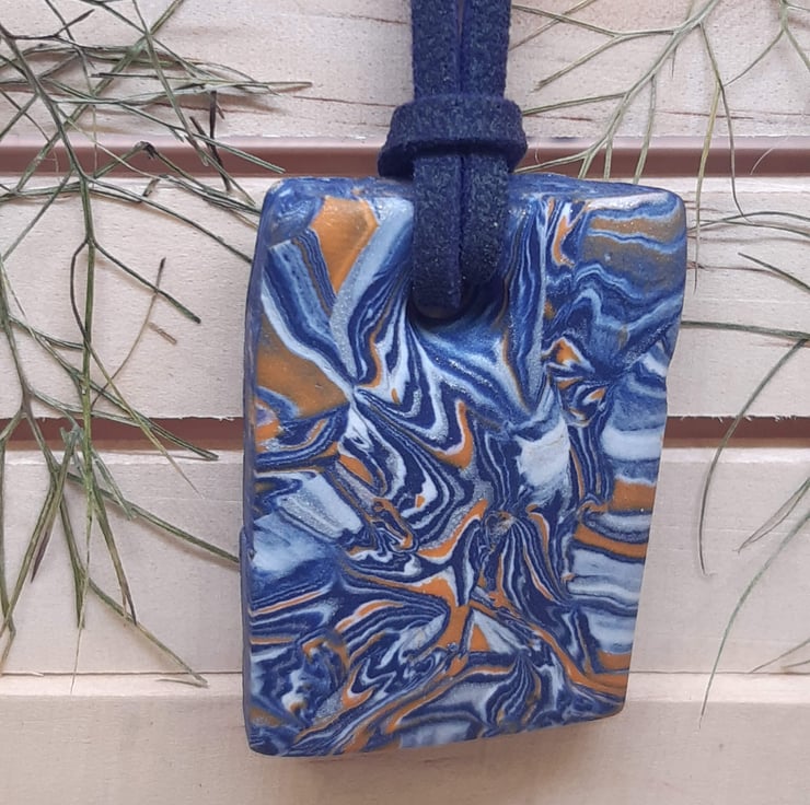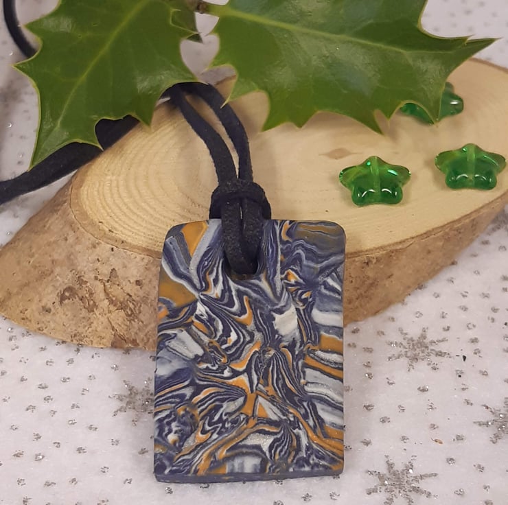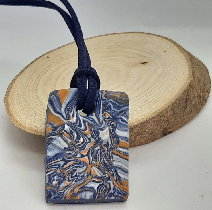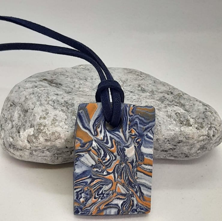 A handmade pendant made from a blend of orange, navy and cream polymer clay in a unique swirl design to create a rectangular shape measuring 40mm deep x 29.5 wide. The back is patterned in a similar way and could be worn with either side.