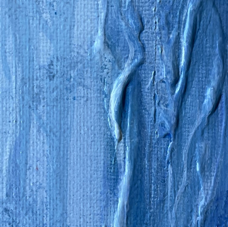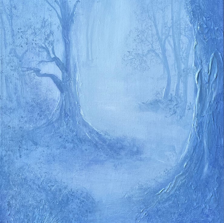 The painting is an original artwork painted in cool blue acrylic paint with textural marks to define the main trunk of the old sweet chestnut tree on the right hand side and the foliage of the foreground and signed by myself, the artist.