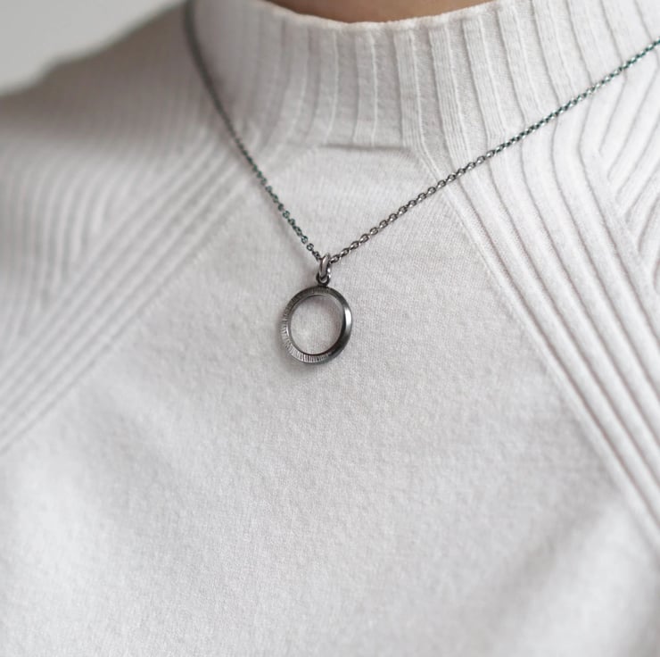 The shape of the crescent moon inspired this circle pendant necklace. The hammered texture shimmers under the light as you move around, contrasting with the smooth, glistening inner edge.