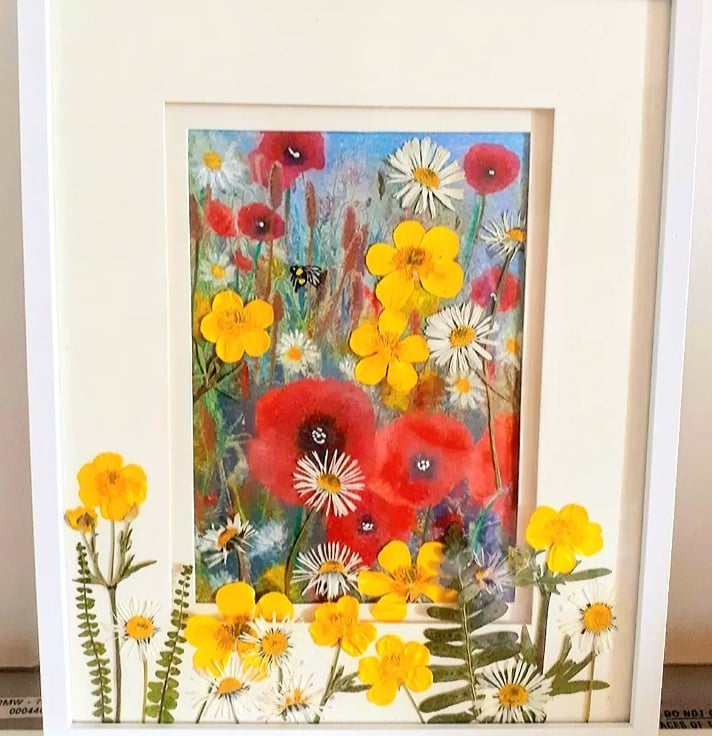 This is another in my collection of embellished original pastel paintings ...simply depicting a meadow with meadow flowers and bumble bees .I have hand drawn the poppies ...grasses and bumble bees and embellished the picture with hand pressed meadow flowers ...buttercups ..daisies and fern...painting and embellishments are protected behind glass in a double mounted 10 x 8 ins white wood frame ....Painting is copyrighted with Copyright House....it will be well protected for postage .I offer free postage