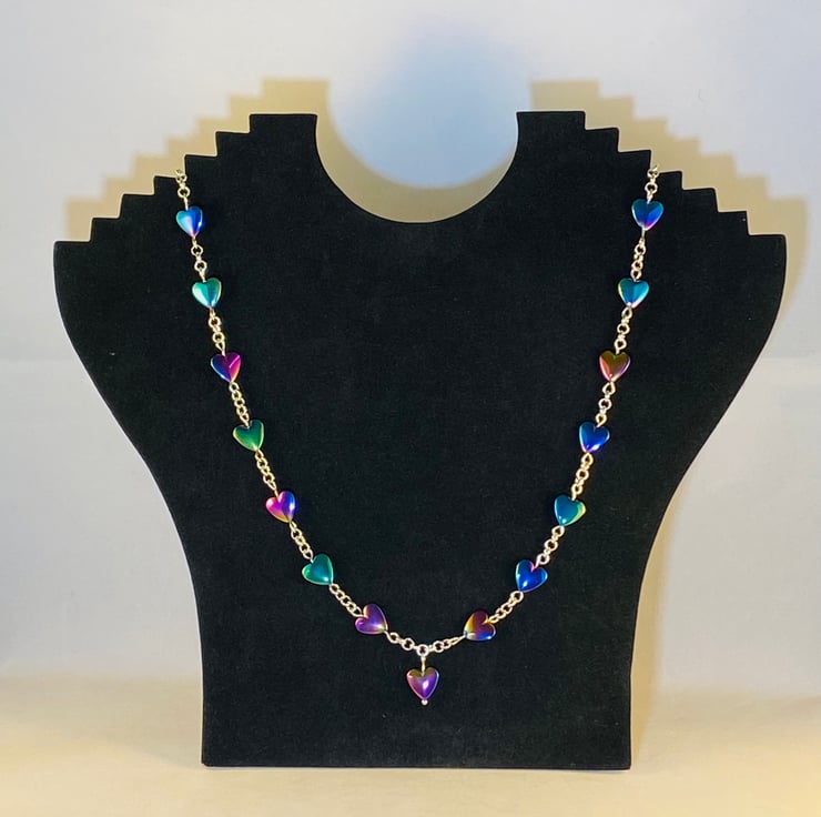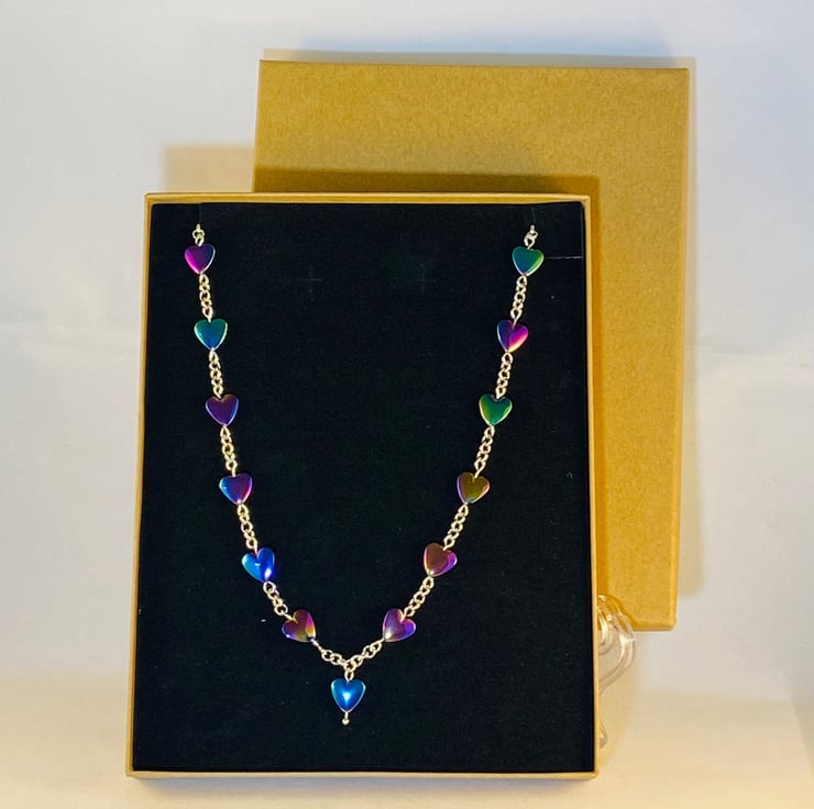 Stunning necklace made using rainbow hematite heart shaped beads on silver plated belcher chain with silver claw clasp