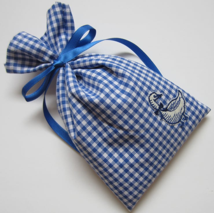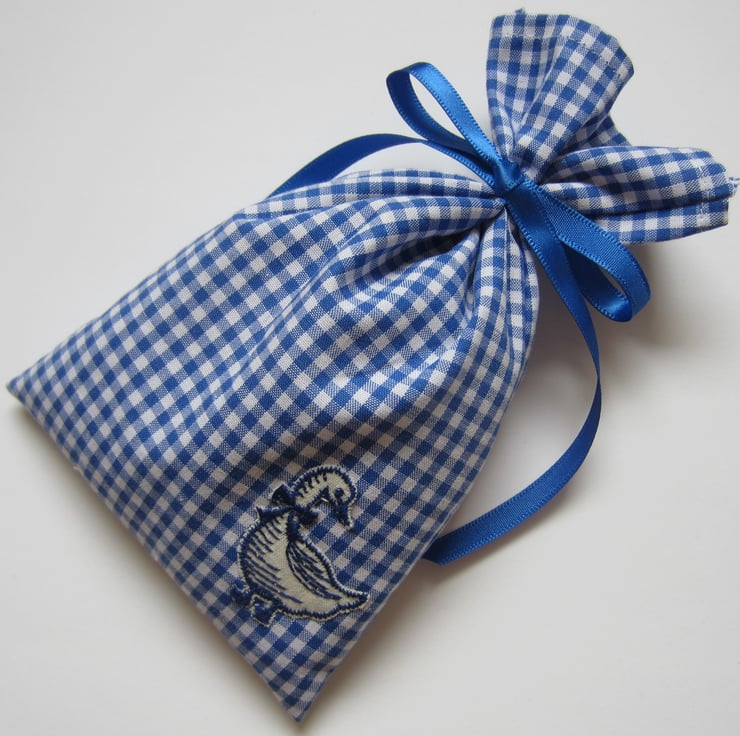 Lavender drawer sachet made from blue and white gingham fabric and decorated with a vintage goose motif.