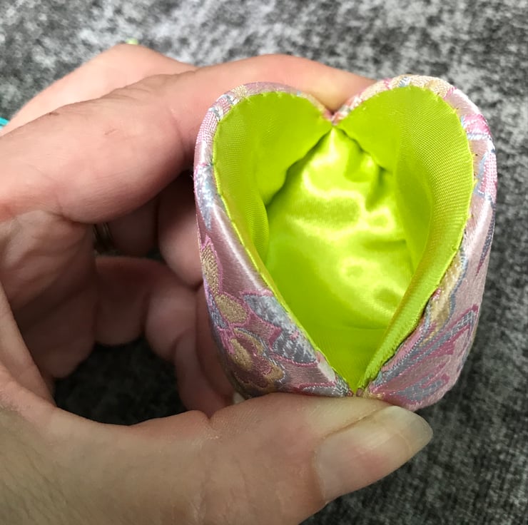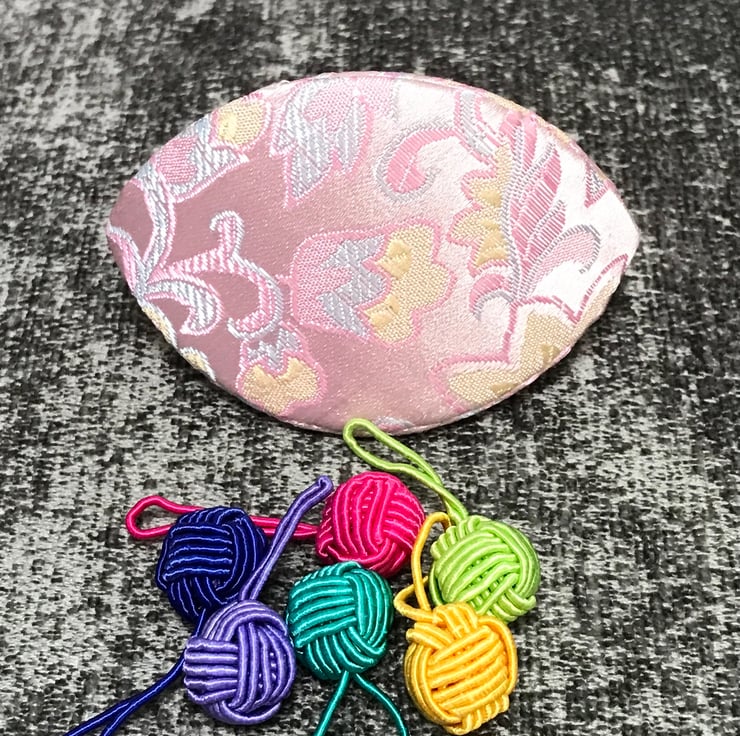 This beautiful Dumpling case is made from brocade and lined with a golden silk. It is ideal for keeping notions such as stitch markers and sewing needles.