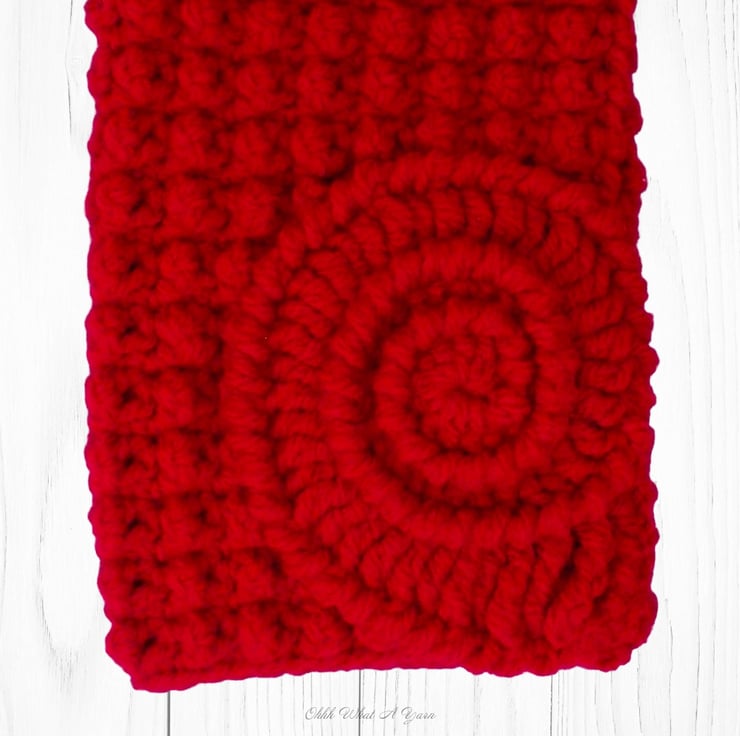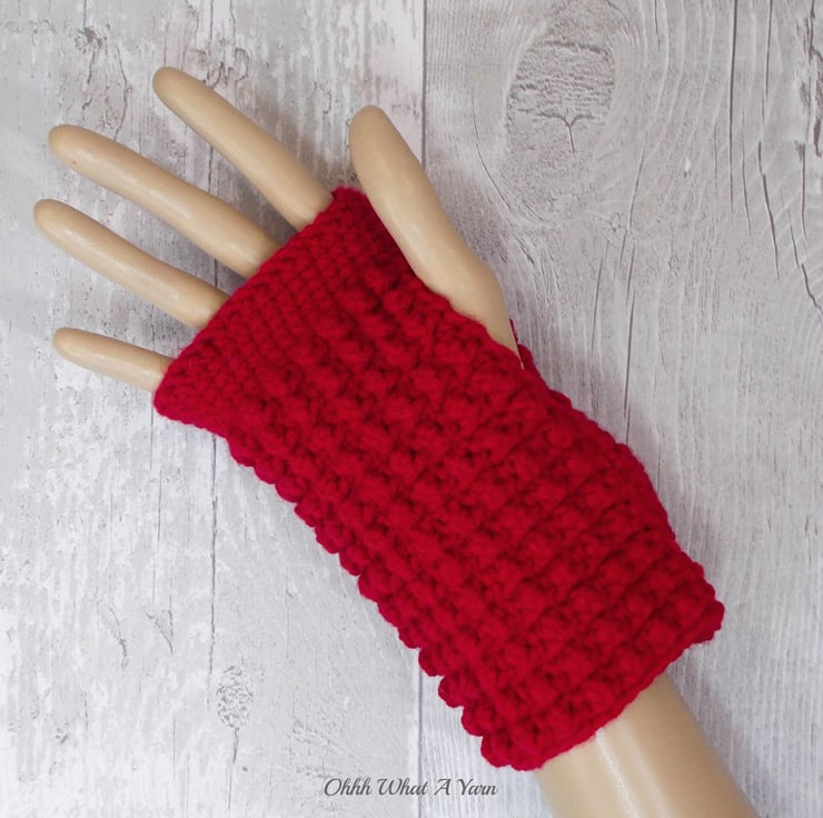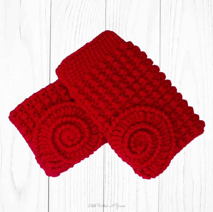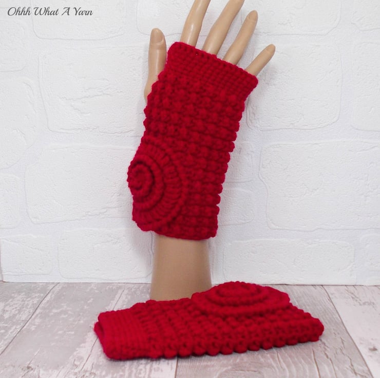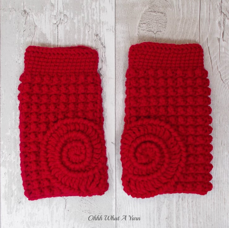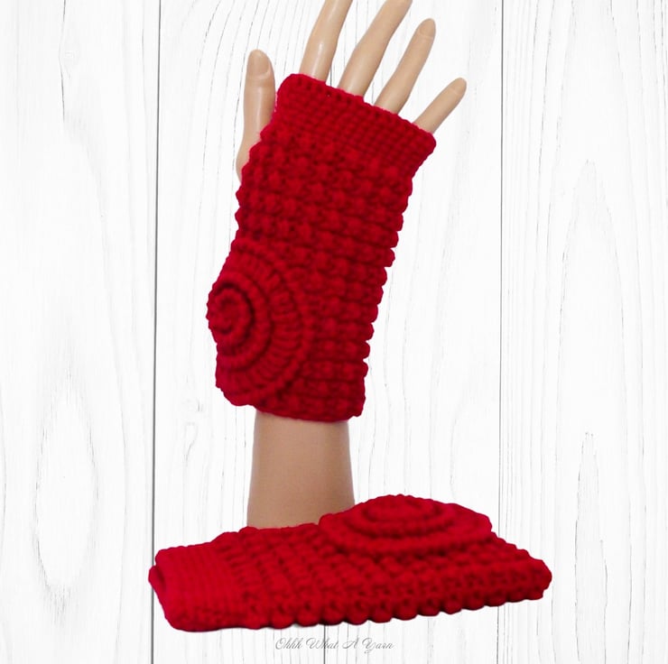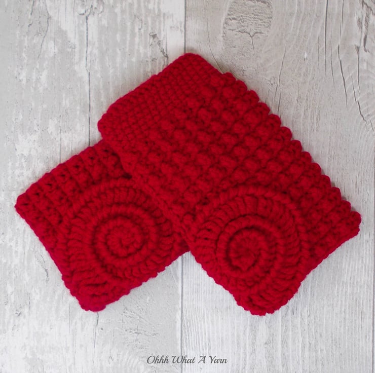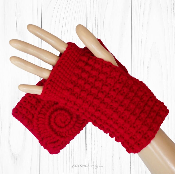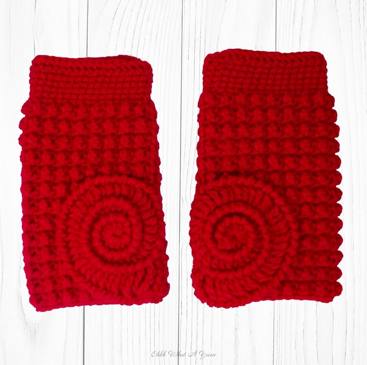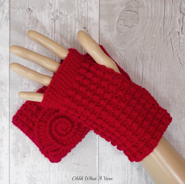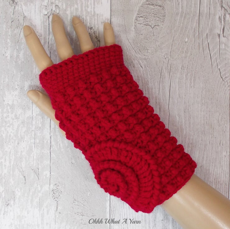 These gorgeous ammonite fingerless gloves have been crocheted using 100% acrylic yarns in a beautiful dark red colour.